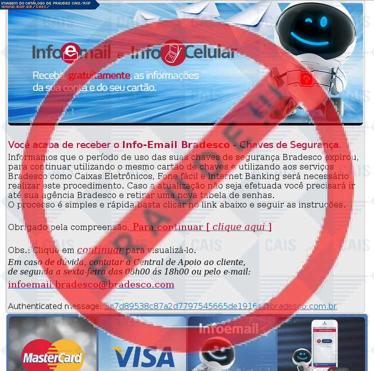 | comentário | O usuário recebe um e-mail informando que sua chave de segurança da conta do banco Bradesco expirou sendo necessário realizar uma atualização no link disponibilizado, entretanto a página fornecida é falsa criada para roubar os dados bancários da vítima. | |