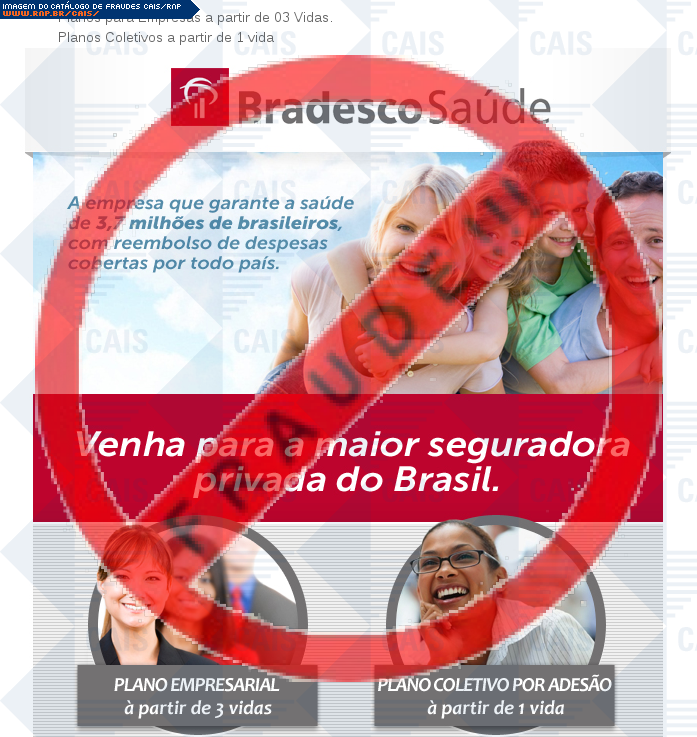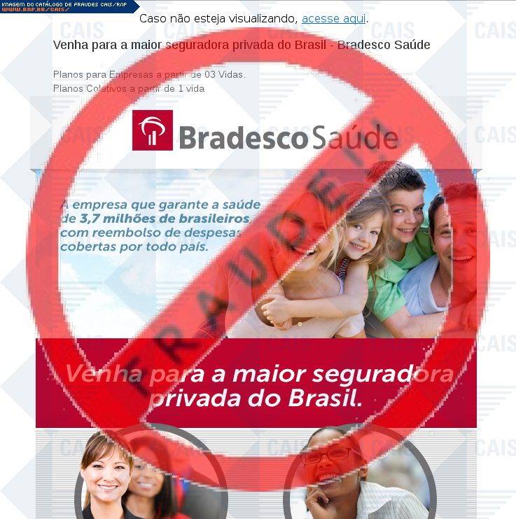 | comentário | O usuário recebe um e-mail informando sobre o seguro de saúde do grupo Bradesco Saúde com o link para cadastro disponível, no entanto a página é falsa destinada a roubar informações da vítima. | |