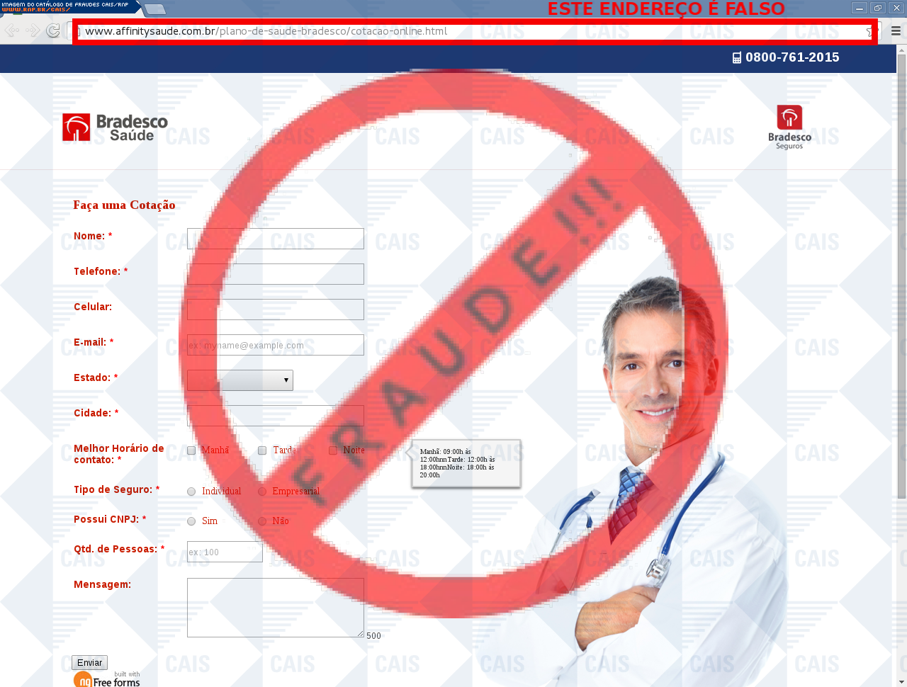 | comentário | A vítima recebe uma mensagem sobre o plano de saúde do banco Bradesco com o link para consulta e informações disponíveis no link indicado, no entanto a página é falsa criada para capturar algumas informações da vítima. | |
