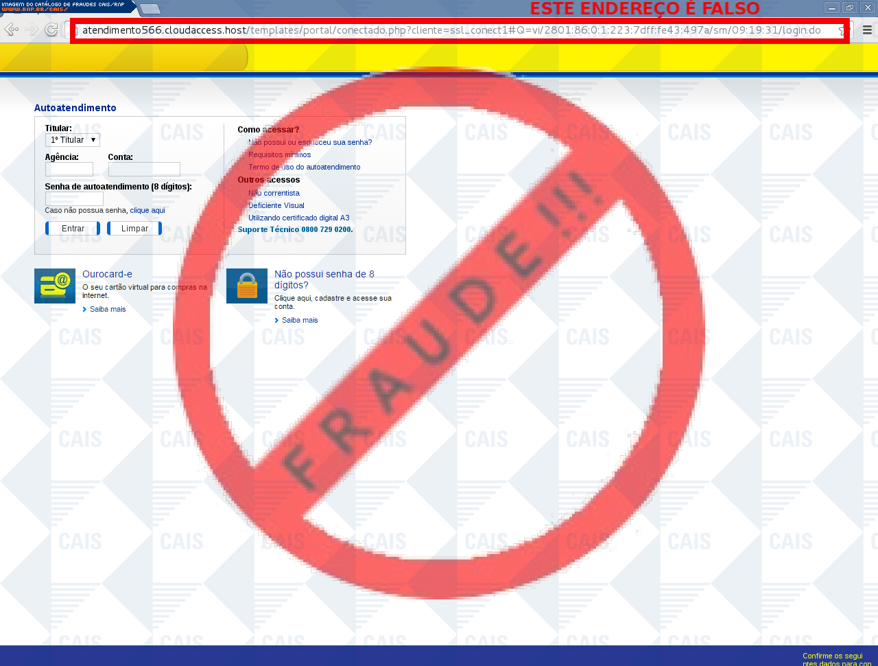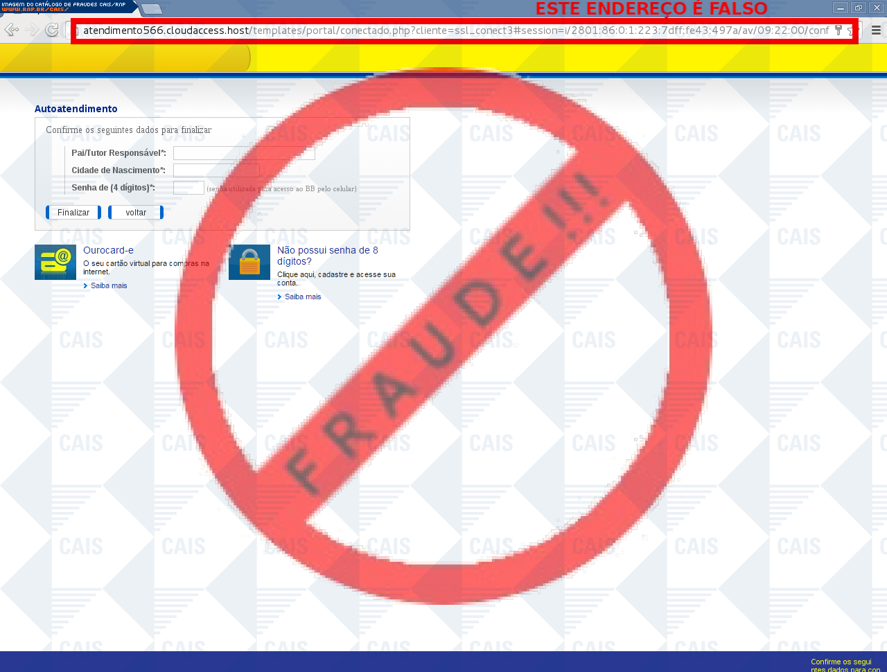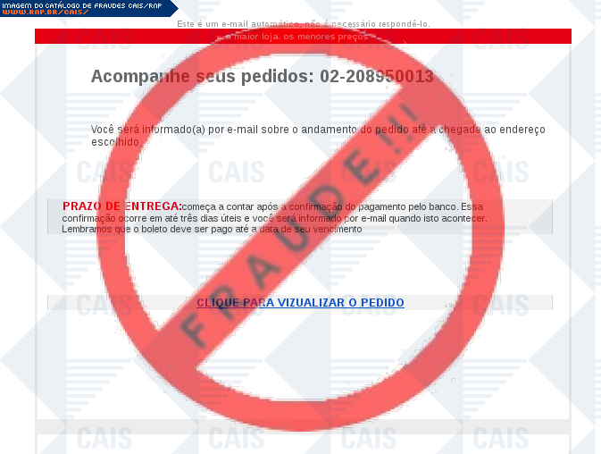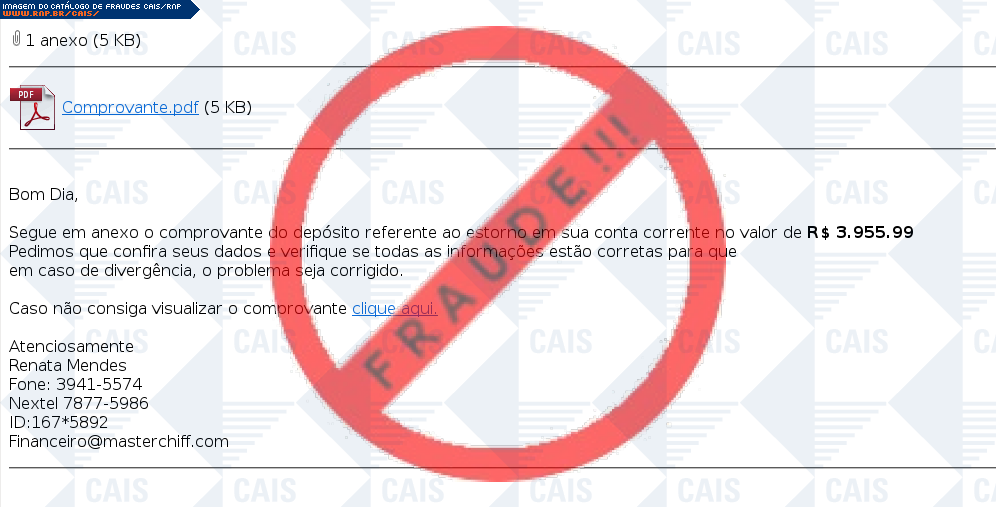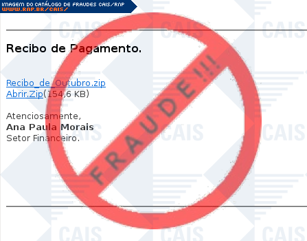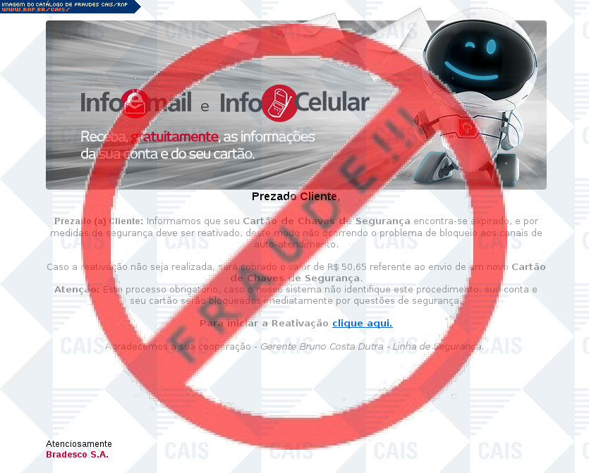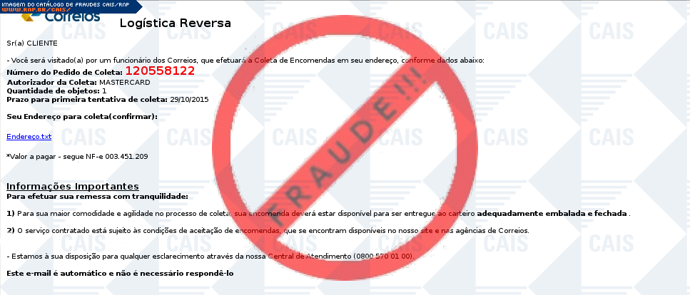 Esta página tem função informativa e educativa. Exibe uma coleção de imagens de phishing scam (fraudes eletrônicas) ou malware (código malicioso) veiculados por meio de spam (e-mail não-solicitado). Trata-se de conteúdo exemplificativo, não exaustivo, uma vez que não é possível contemplar todos os casos de fraudes existentes. Assim, caso você tenha conhecimento de um exemplar que não esteja aqui presente, isto não significa que não seja válido ou real. Inclusive incentivamos que você o envie para análise do CAIS para que, se for o caso, passe a integrar o nosso acervo.