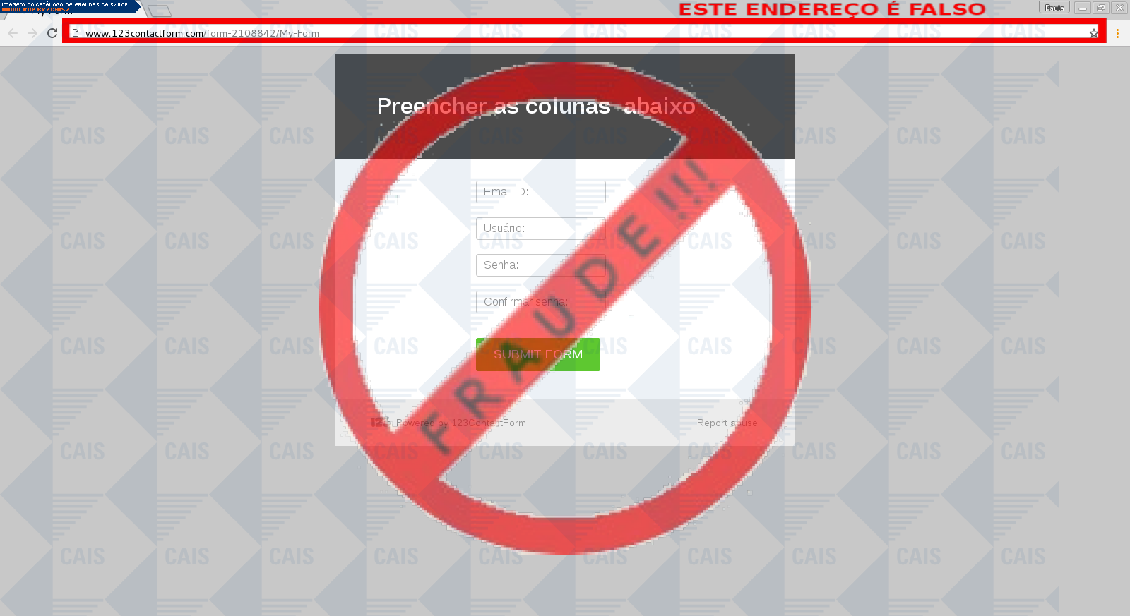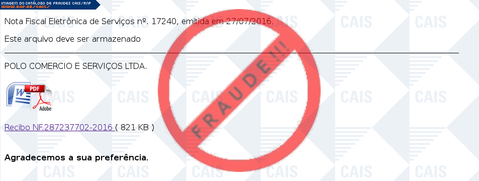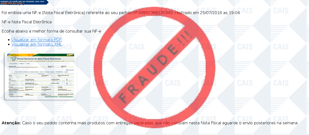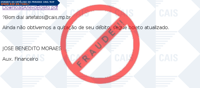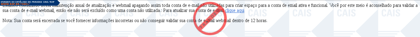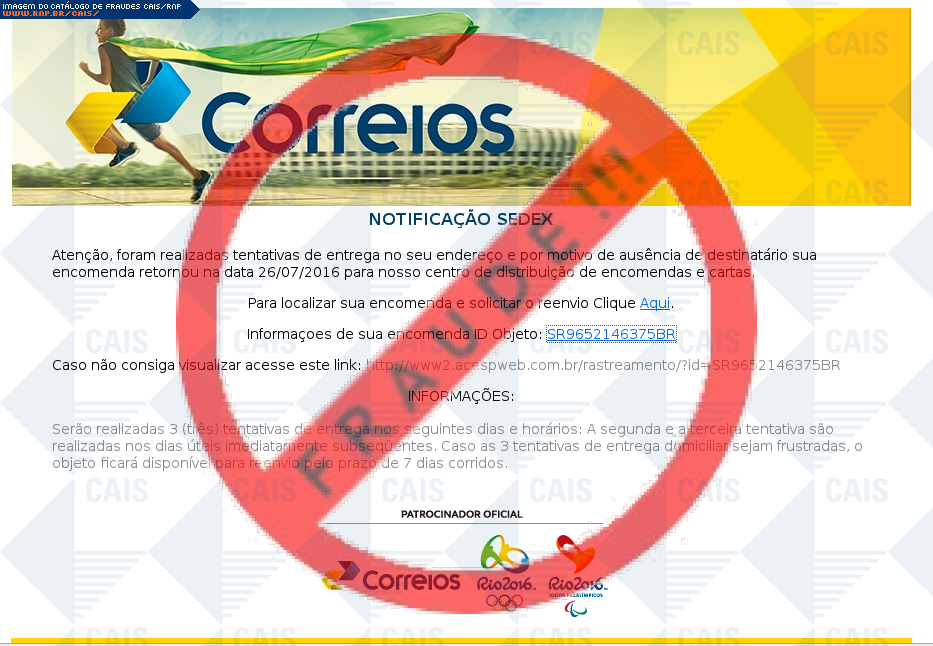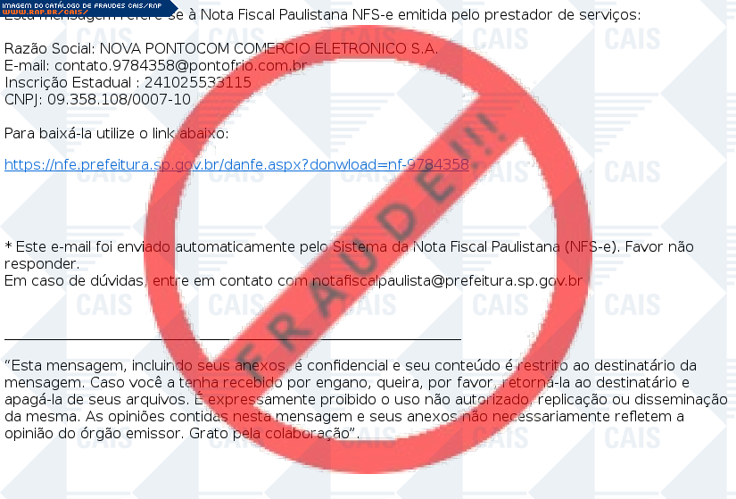 Esta página tem função informativa e educativa. Exibe uma coleção de imagens de phishing scam (fraudes eletrônicas) ou malware (código malicioso) veiculados por meio de spam (e-mail não-solicitado). Trata-se de conteúdo exemplificativo, não exaustivo, uma vez que não é possível contemplar todos os casos de fraudes existentes. Assim, caso você tenha conhecimento de um exemplar que não esteja aqui presente, isto não significa que não seja válido ou real. Inclusive incentivamos que você o envie para análise do CAIS para que, se for o caso, passe a integrar o nosso acervo.