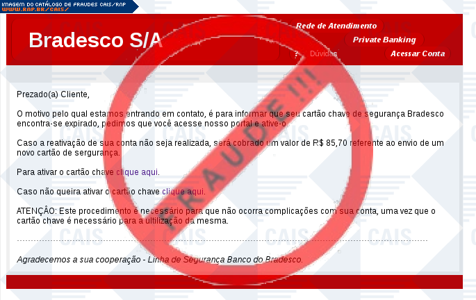 | comentário | O usuário recebe um e-mail informando que sua chave de segurança da conta no banco Bradesco expirou sendo necessário realizar uma atualização no link disponibilizado, entretanto a página fornecida é falsa criada para roubar os dados bancários da vítima. | |