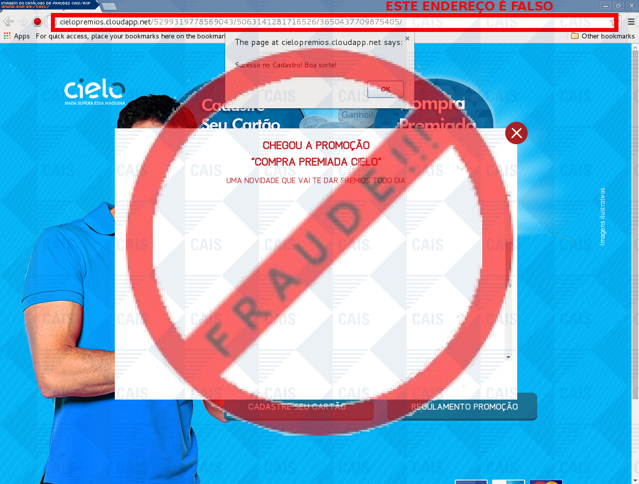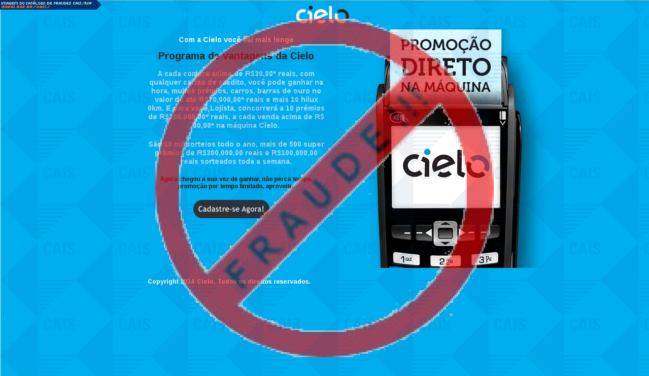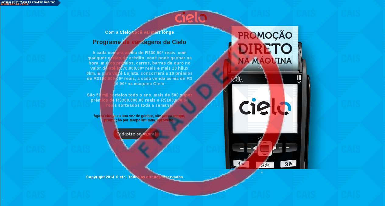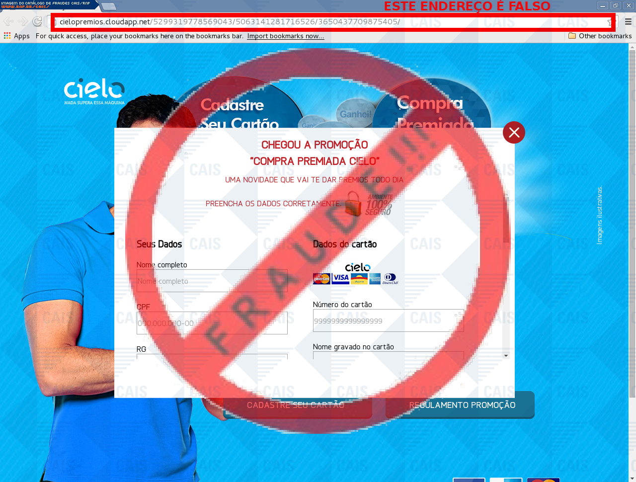 | comentário | A vítima recebe um e-mail informando sobre promoções relacionados a seu cartão Cielo sendo necessário realizar um cadastro, no entanto a página é falsa destinada a roubar os dados do cartão de crédito do usuário. | |