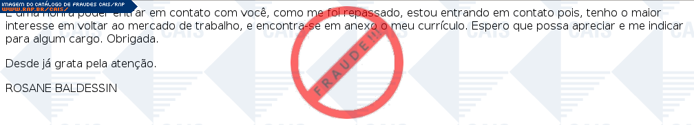 | comentário | O usuário recebe uma mensagem contendo um cúrriculo para análise disponível para download, no entanto o arquivo originado é malicioso criado para roubar informações da vítima e instalar outros arquivos fraudulentos com o nome de Trojan.Win32.Banker.ink. | |