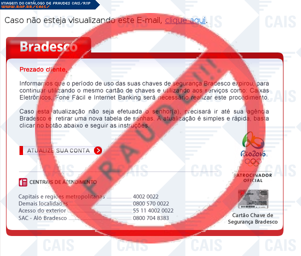 | comentário | O usuário recebe um e-mail informando que sua chave de segurança da conta do banco Bradesco expirou sendo necessário realizar uma atualização no link disponibilizado, entretanto a página fornecida é falsa criada para roubar os dados bancários da vítima. | |