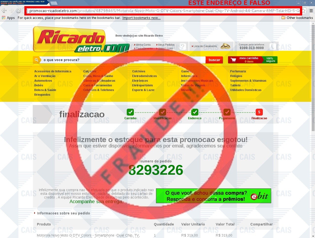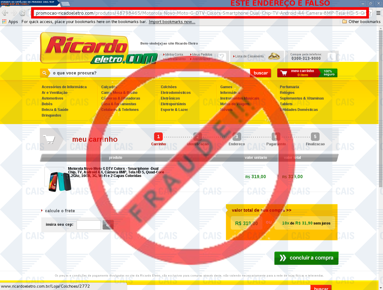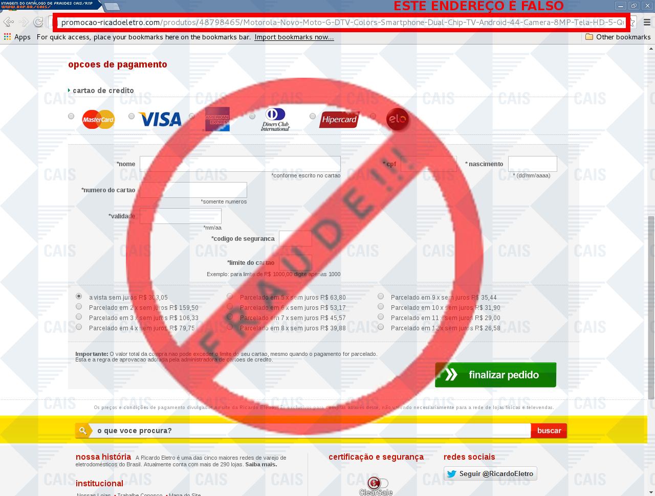 | comentário | A vítima recebe um e-mail informando sobre promoções no site de compra da Ricardo Eletro disponibilizando link de vários produtos em desconto, no entanto a página é falsa destinada a roubar as informações pessoais e do cartão do usuário. | |
