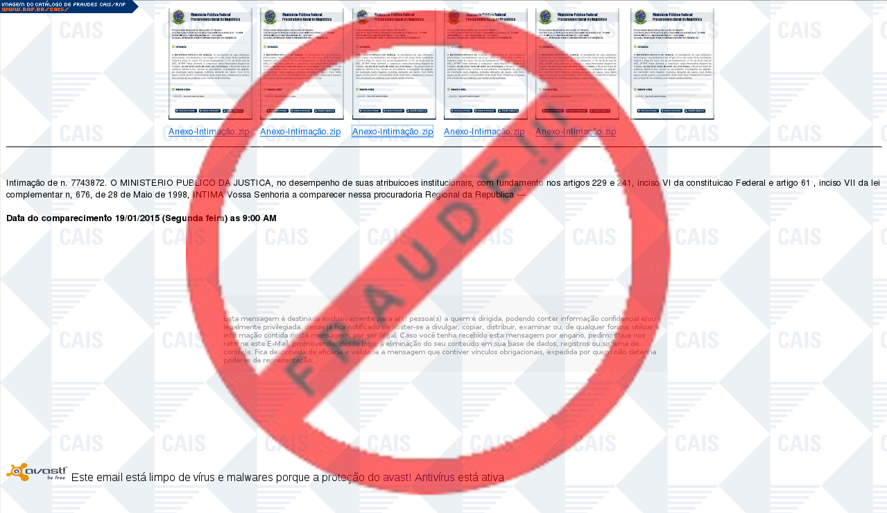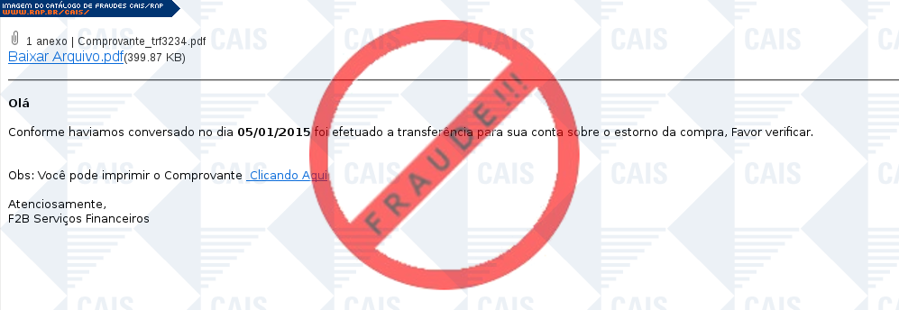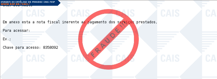 Esta página tem função informativa e educativa. Exibe uma coleção de imagens de phishing scam (fraudes eletrônicas) ou malware (código malicioso) veiculados por meio de spam (e-mail não-solicitado). Trata-se de conteúdo exemplificativo, não exaustivo, uma vez que não é possível contemplar todos os casos de fraudes existentes. Assim, caso você tenha conhecimento de um exemplar que não esteja aqui presente, isto não significa que não seja válido ou real. Inclusive incentivamos que você o envie para análise do CAIS para que, se for o caso, passe a integrar o nosso acervo.