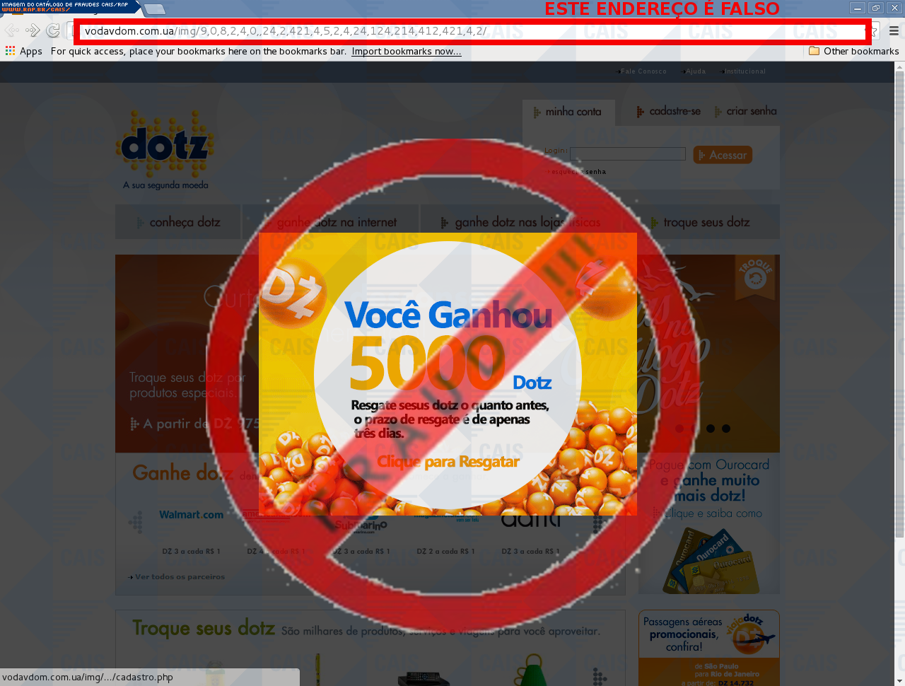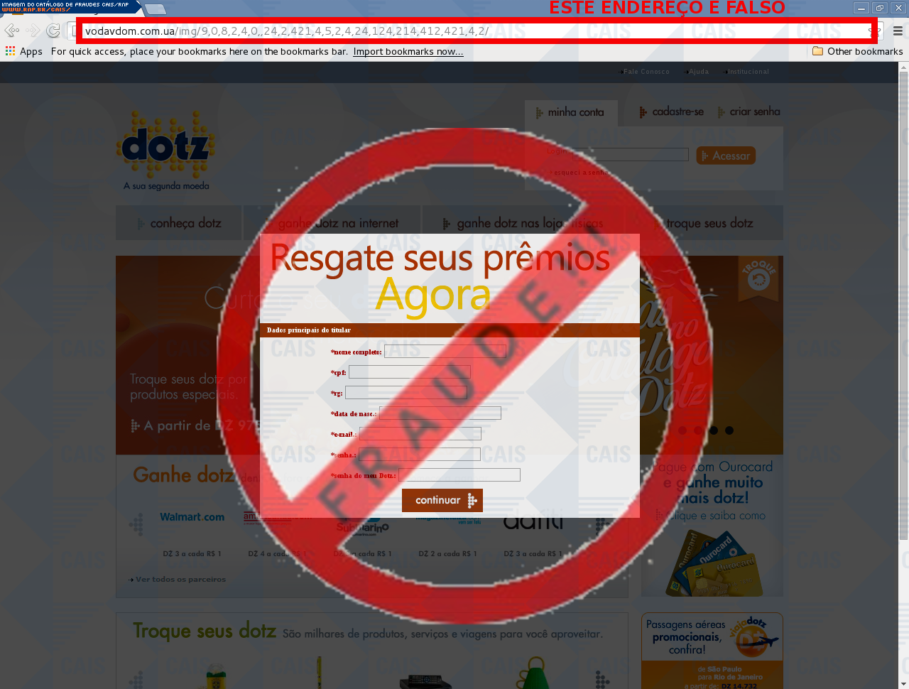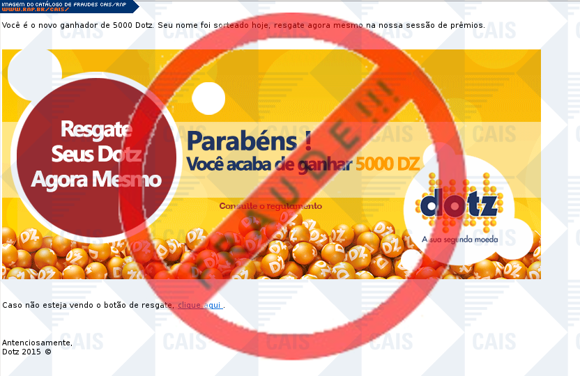 | comentário | O usuário recebe uma mensagem informando que foi sorteado na promoção Dotz sendo necessário preencher algumas informações no link disponibilizado, no entanto a página é falsa criada para roubar os dados da vítima. | |