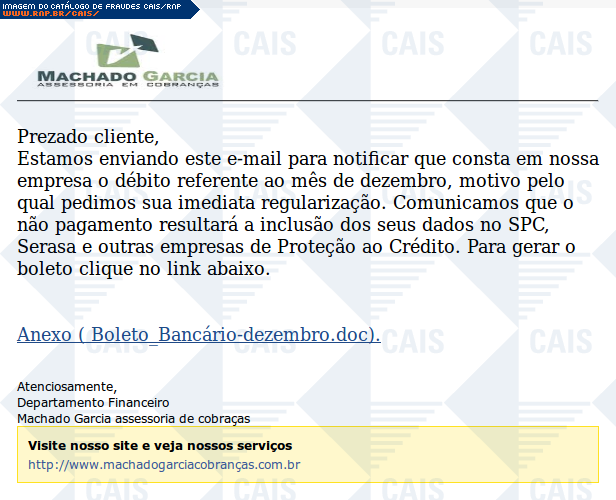 | comentário | Mensagem falsa da empresa Machado Garcia que estaria enviando um boleto. O link contido na mensagem leva ao arquivo malicioso que foi identificado como Trojan-Spy:W32/Banker.JGT (F-Secure). | |