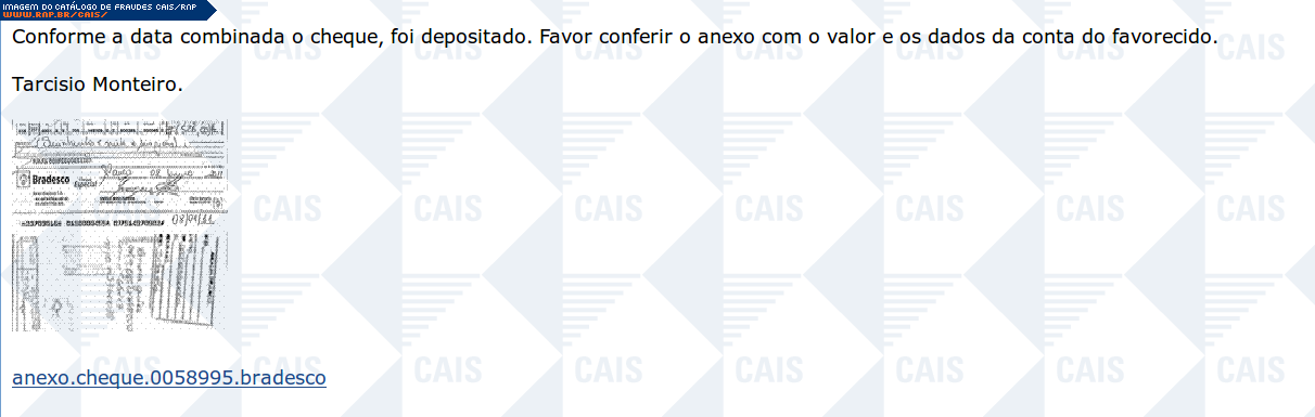 | comentário | Mensagem falsa que conteria em anexo o comprovante do depósito de um cheque. A mensagem contém uma imagem do suposto cheque e um link que leva a conteúdo malicioso que não estava disponível no momento da análise. | |