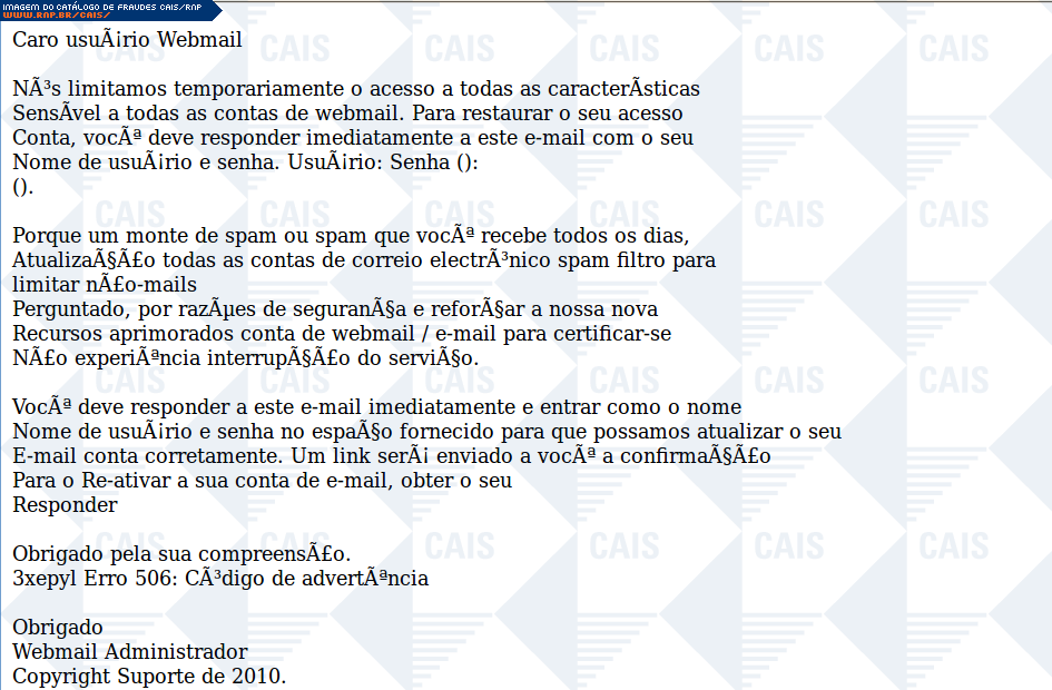 | comentário | Mensagem que contém diversos erros de formatação e alicia o usuário a responder o email com seus dados pessoais e a senha de seu email. | |