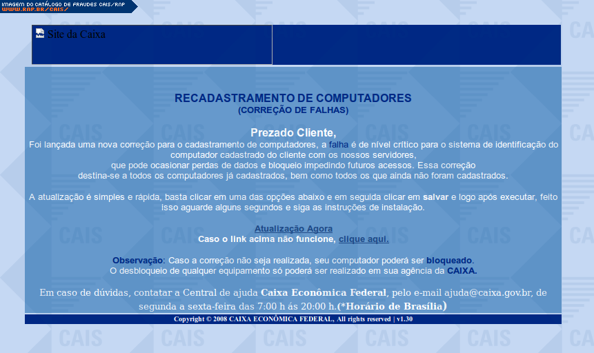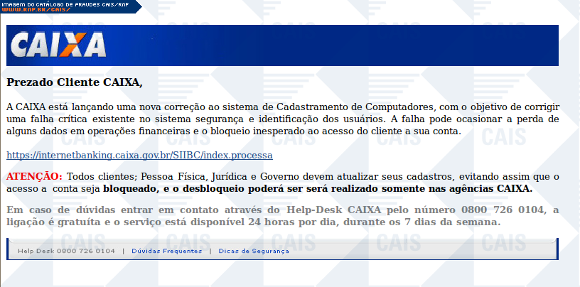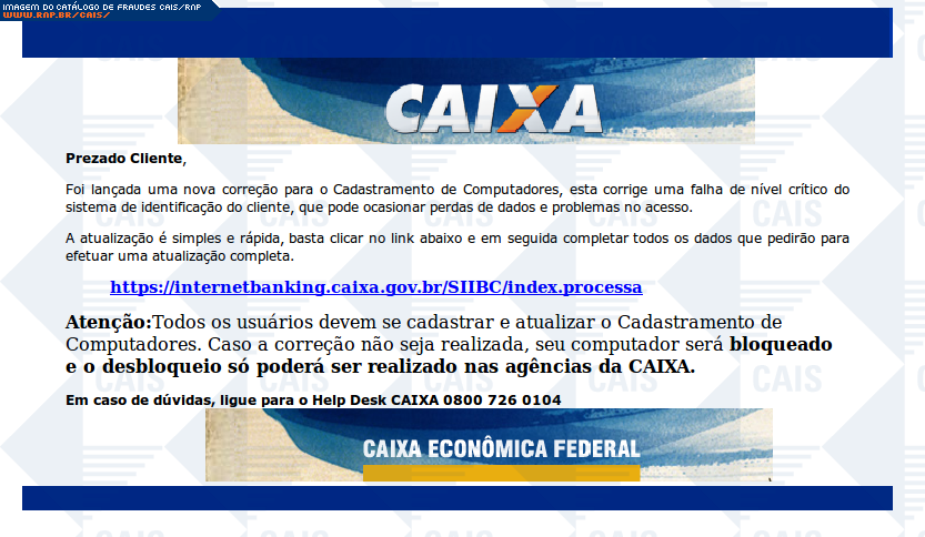 | comentário | Mensagem que se passa por um comunicado do banco Caixa Econômica Federal solicitando que a vítima realize a correção do cadastramento de computadores.A fraude contém um link que leva a conteúdo malicioso que não estava disponível no momento da análise. | |