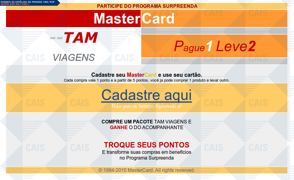 | comentário | Mensagem falsa anunciando a promoção Surpreenda da Mastercard e Tam. A fraude contém um link para o cadastro na promoção que leva a uma página falsa que não estava disponível no momento da análise. | |