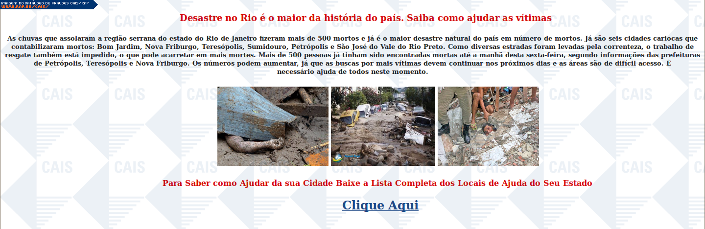 Esta página tem função informativa e educativa. Exibe uma coleção de imagens de phishing scam (fraudes eletrônicas) ou malware (código malicioso) veiculados por meio de spam (e-mail não-solicitado). Trata-se de conteúdo exemplificativo, não exaustivo, uma vez que não é possível contemplar todos os casos de fraudes existentes. Assim, caso você tenha conhecimento de um exemplar que não esteja aqui presente, isto não significa que não seja válido ou real. Inclusive incentivamos que você o envie para análise do CAIS para que, se for o caso, passe a integrar o nosso acervo.