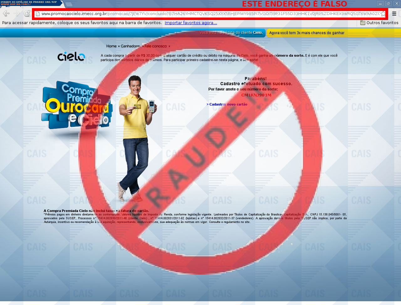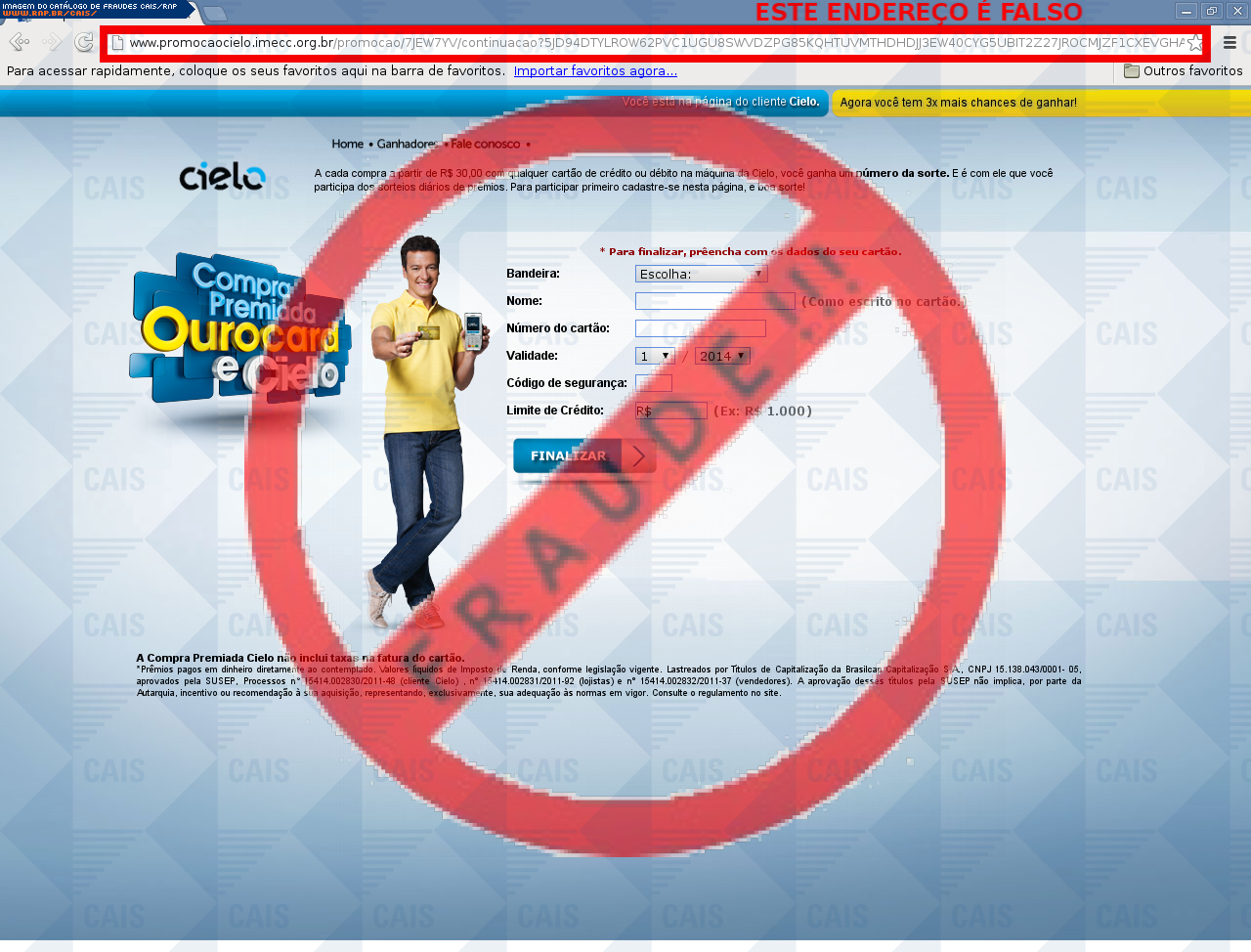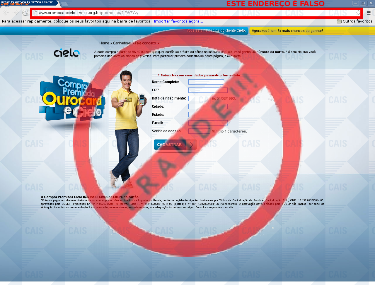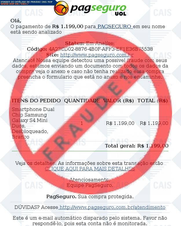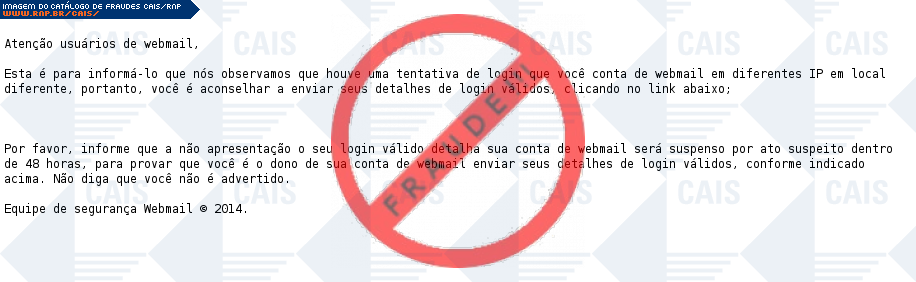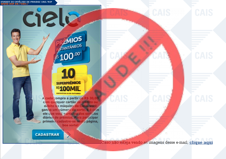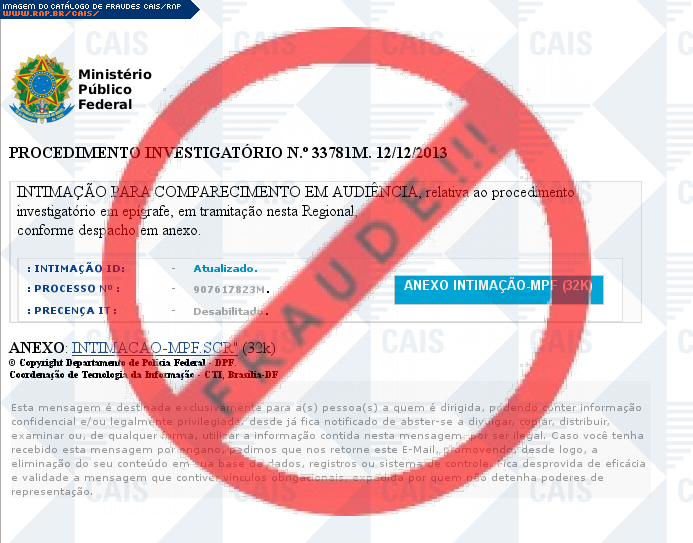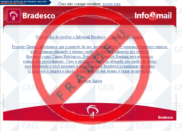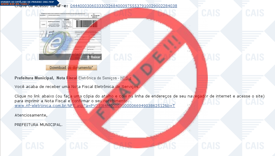 Esta página tem função informativa e educativa. Exibe uma coleção de imagens de phishing scam (fraudes eletrônicas) ou malware (código malicioso) veiculados por meio de spam (e-mail não-solicitado). Trata-se de conteúdo exemplificativo, não exaustivo, uma vez que não é possível contemplar todos os casos de fraudes existentes. Assim, caso você tenha conhecimento de um exemplar que não esteja aqui presente, isto não significa que não seja válido ou real. Inclusive incentivamos que você o envie para análise do CAIS para que, se for o caso, passe a integrar o nosso acervo.