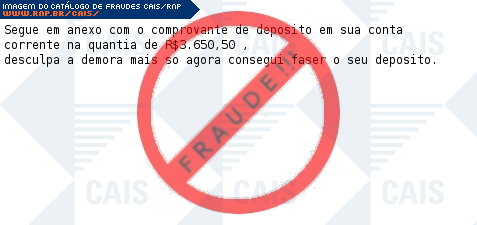| comentário | A vítima recebe uma mensagem, contendo em anexo um comprovante de depósito em sua conta bancária. Mas ao clicar no link, inicia-se o download de um software malicioso. | |