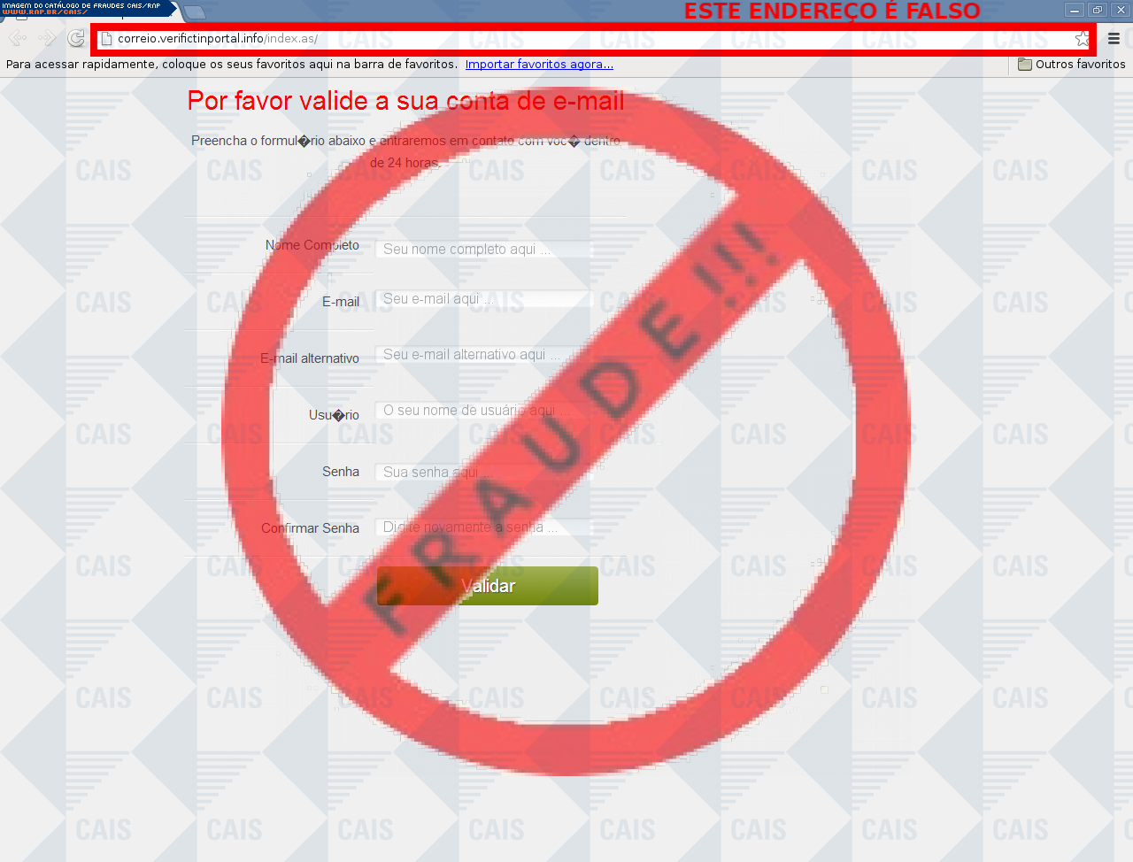 | comentário | A vítima recebe uma mensagem, informando que é necessário validar a sua conta de e-mail, mas ao clicar no link, a vítima é direcionada para uma página falsa, que é usada para roubar sua conta de e-mail. | |