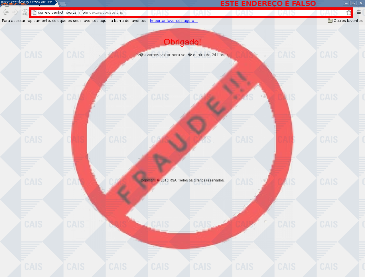Com a disponibilização pública deste serviço, não é intenção do Centro de Atendimento a Incidentes de Segurança (CAIS) da Rede Nacional de Ensino e Pesquisa (RNP) violar direitos autorais sobre marcas registradas ou logotipos de empresas que porventura constem das amostras. O objetivo é tão somente alertar os usuários sobre as espécies de golpes que se utilizam de tais propriedades intelectuais ou industriais de forma criminosa.