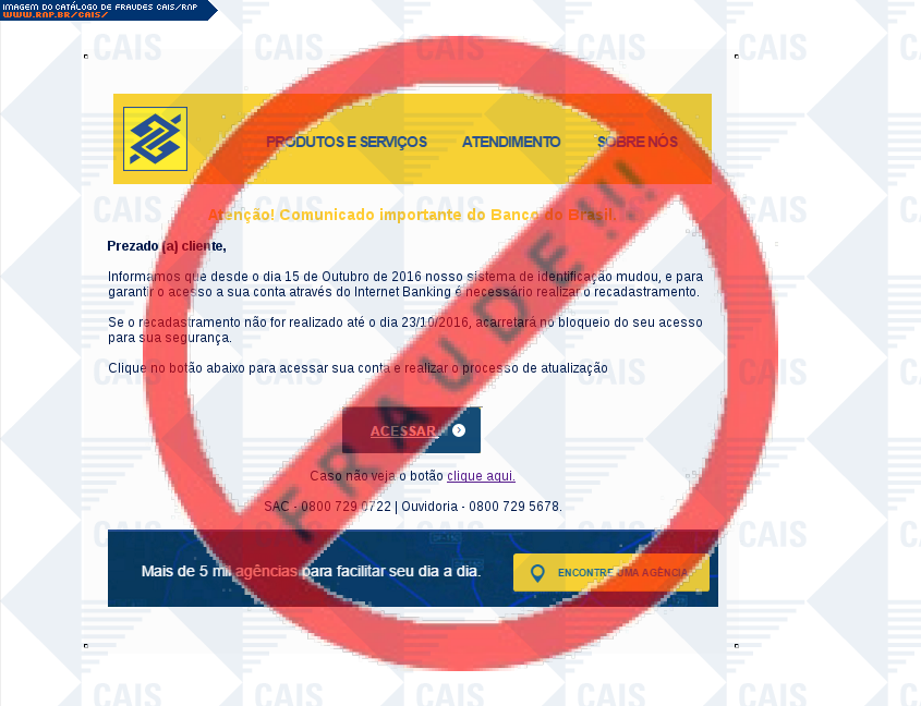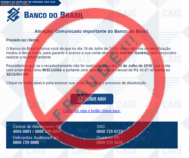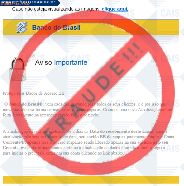 Esta página tem função informativa e educativa. Exibe uma coleção de imagens de phishing scam (fraudes eletrônicas) ou malware (código malicioso) veiculados por meio de spam (e-mail não-solicitado). Trata-se de conteúdo exemplificativo, não exaustivo, uma vez que não é possível contemplar todos os casos de fraudes existentes. Assim, caso você tenha conhecimento de um exemplar que não esteja aqui presente, isto não significa que não seja válido ou real. Inclusive incentivamos que você o envie para análise do CAIS para que, se for o caso, passe a integrar o nosso acervo.