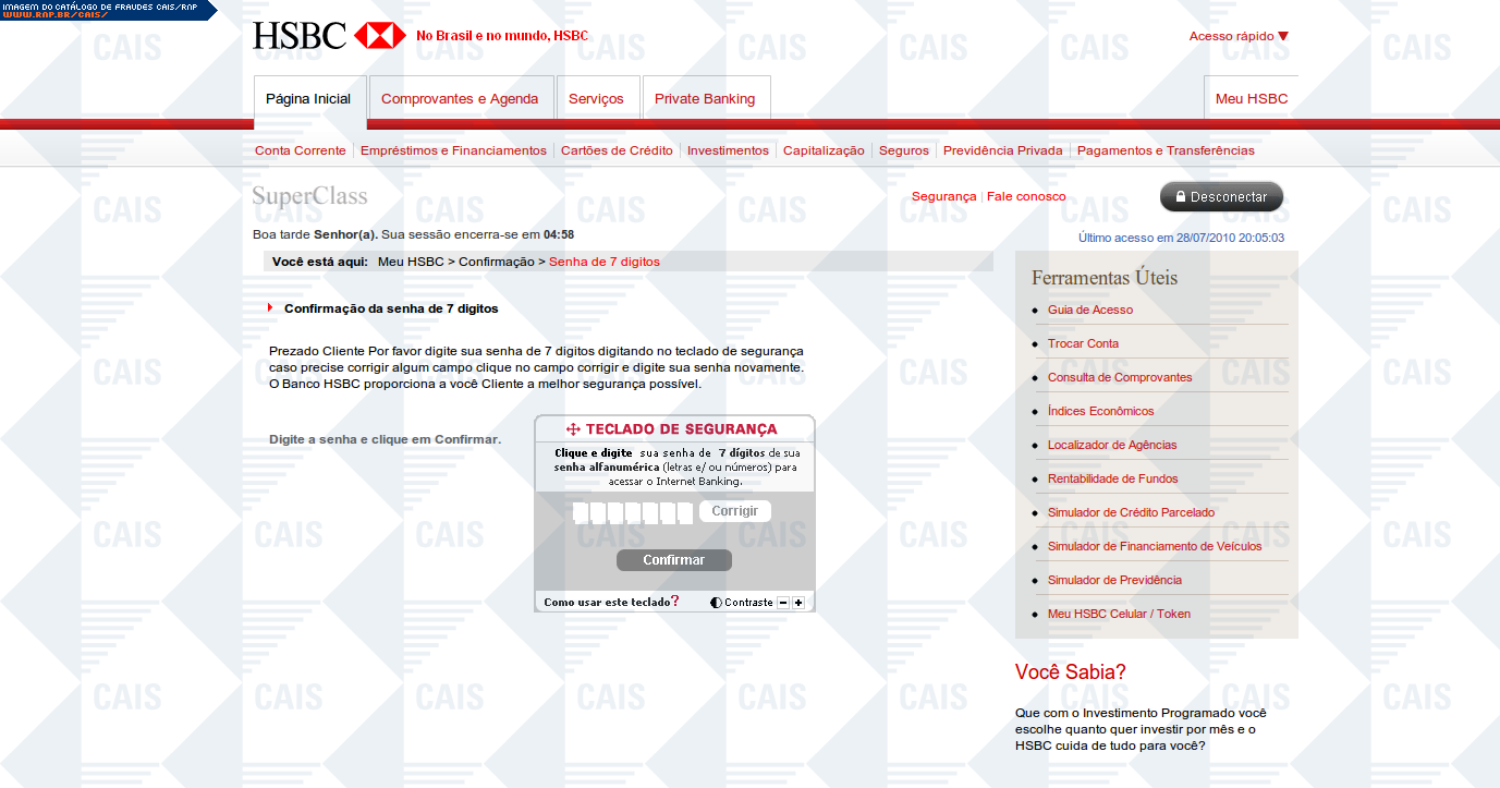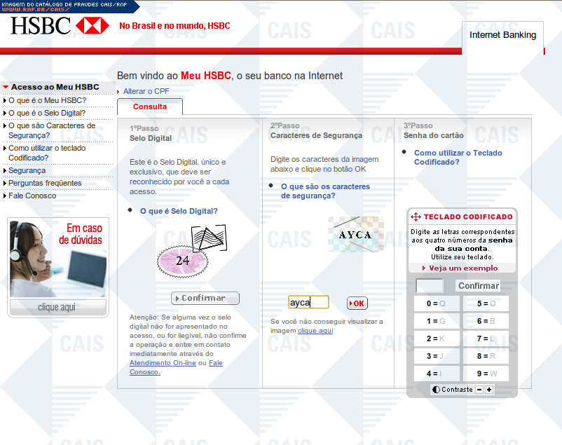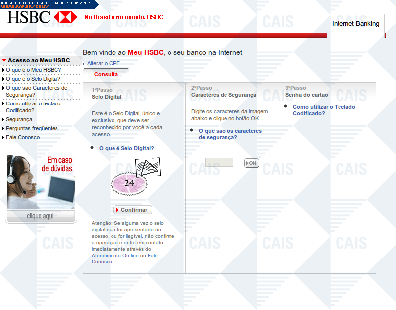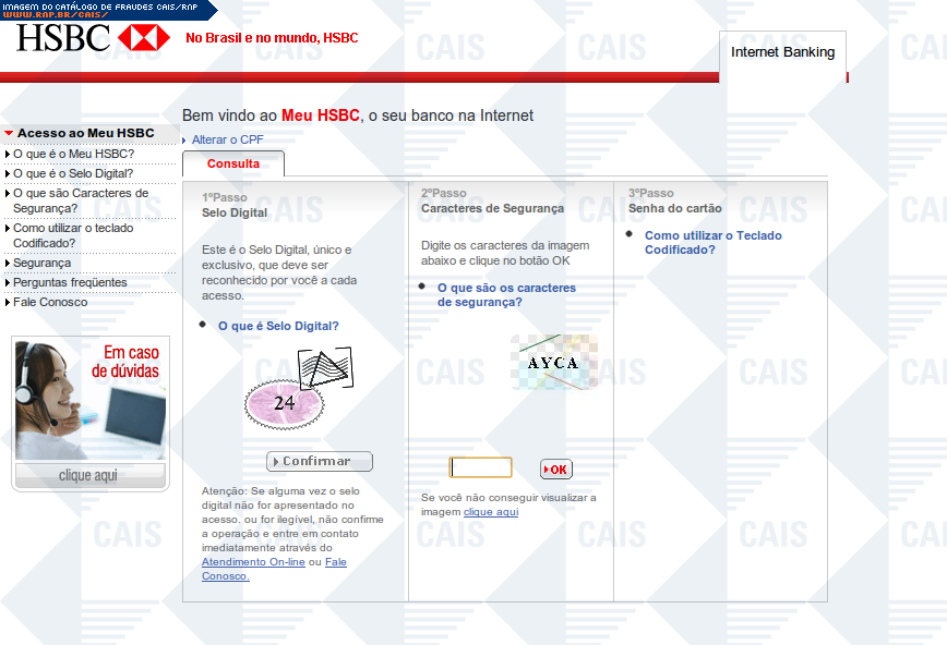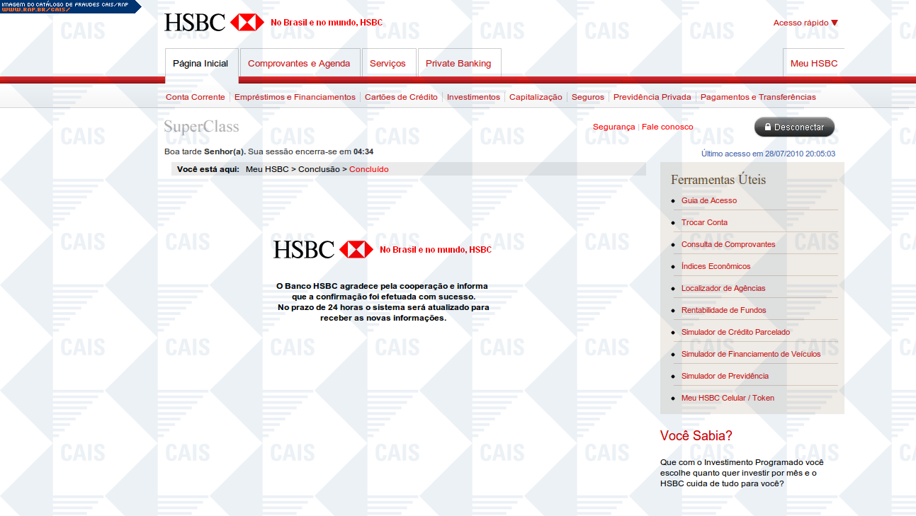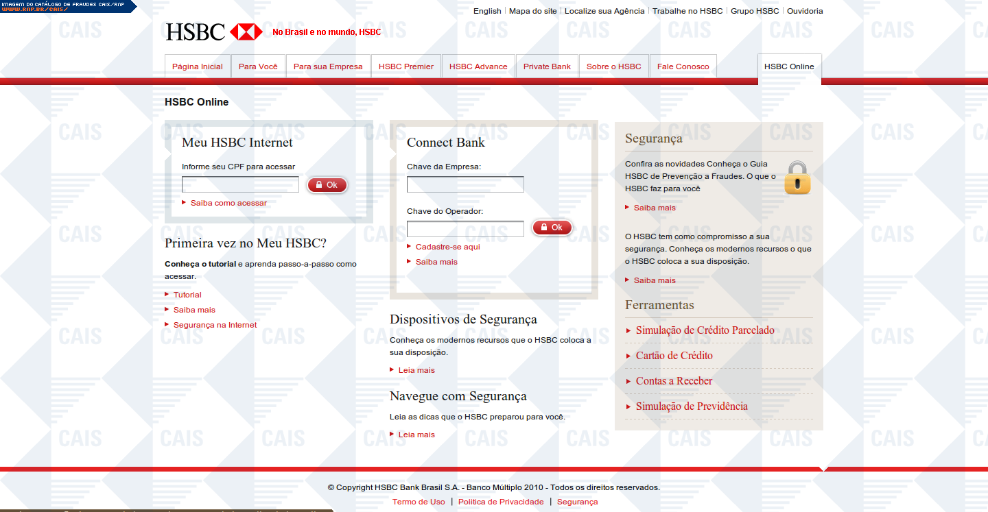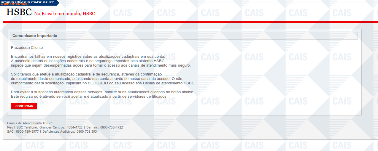 | comentário | Comunicado falso, em nome do banco HSBC, informando foram enconcontradas falhas enos registros sobre as atualizações cadastrais da vítima. A fraude fornece um link para a suposta atualização. O link leva a um site falso, destinado a roubar dados da conta... (leia mais) | |