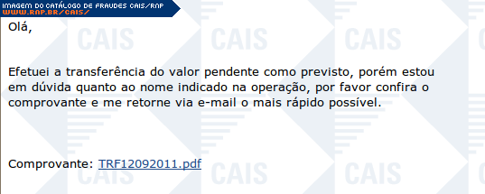 | comentário | A mensagem contém um link para um suposto comprovante de transferência. O remetende ainda pede que a vítima confira todos os dados. O link leva ao software malicioso que foi identificado como Gen:Trojan.Heur.DP.CGW@aaXRq@hG (BitDefender). | |
