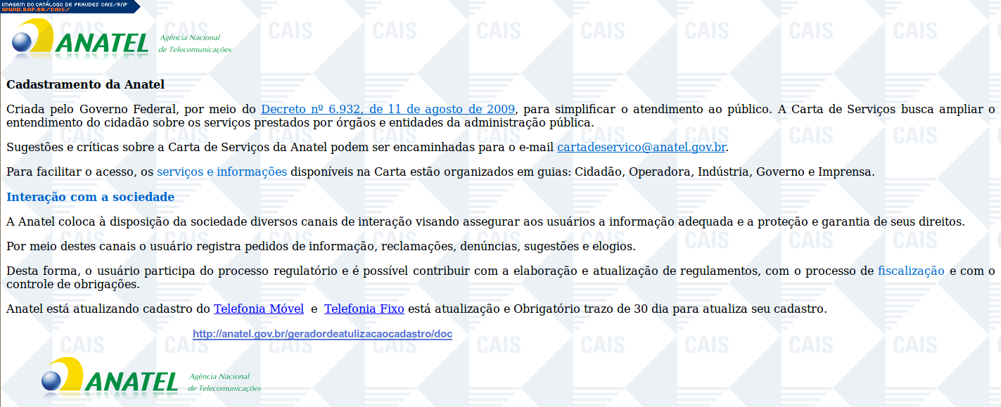 | comentário | A fraude usa o nome da Anatel para enviar um link para a suposta atualização do cadastro da vítima. O link leva ao malware Trojan.Win32.Scar.esmi (Kaspersky). | |