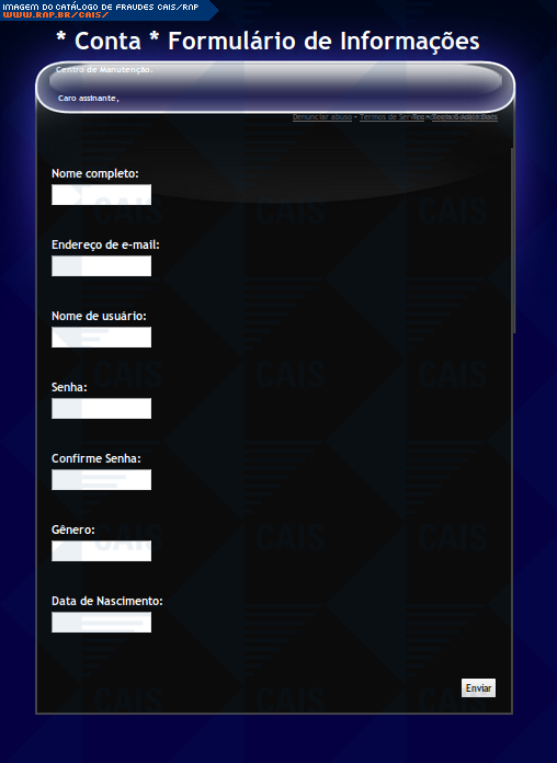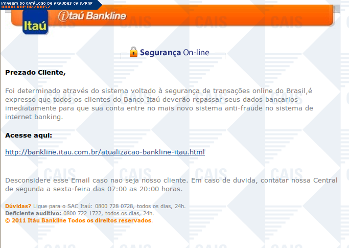 Esta página tem função informativa e educativa. Exibe uma coleção de imagens de phishing scam (fraudes eletrônicas) ou malware (código malicioso) veiculados por meio de spam (e-mail não-solicitado). Trata-se de conteúdo exemplificativo, não exaustivo, uma vez que não é possível contemplar todos os casos de fraudes existentes. Assim, caso você tenha conhecimento de um exemplar que não esteja aqui presente, isto não significa que não seja válido ou real. Inclusive incentivamos que você o envie para análise do CAIS para que, se for o caso, passe a integrar o nosso acervo.