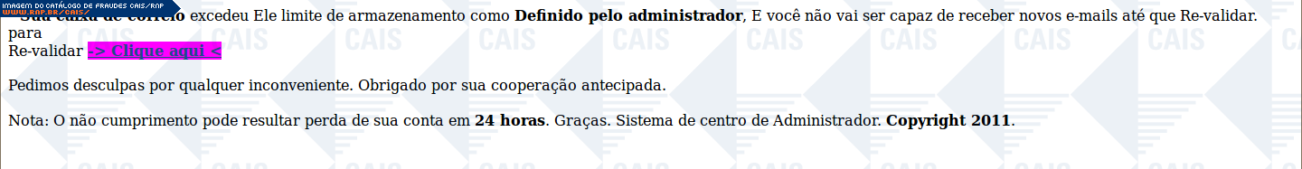 | comentário | A fraude se passa pelo administrador do e-mail da vítima, que informa que a vítima excedeu seu limite armazanamento. O link para a suposta revalidação do e-mail da vítima leva a uma página falsa, destinada a roubar dados pessoais da vítima. | |