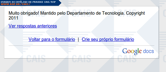 Com a disponibilização pública deste serviço, não é intenção do Centro de Atendimento a Incidentes de Segurança (CAIS) da Rede Nacional de Ensino e Pesquisa (RNP) violar direitos autorais sobre marcas registradas ou logotipos de empresas que porventura constem das amostras. O objetivo é tão somente alertar os usuários sobre as espécies de golpes que se utilizam de tais propriedades intelectuais ou industriais de forma criminosa.