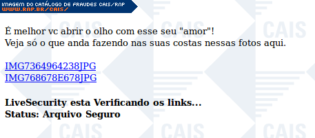 | comentário | A mensagem contém links para supostas fotos que provam que a vítima está sendo traída. O conteúdo malicioso não estava mais disponível no momento da análise. | |