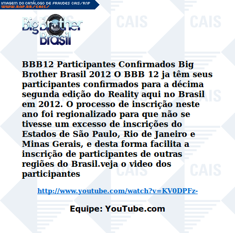 | comentário | A mensagem contém um link para um suposto vídeo do youtube.com com imagens dos participantes do Big Brother Brasil 12. O conteúdo malicioso não estava mais disponível no momento da análise. | |