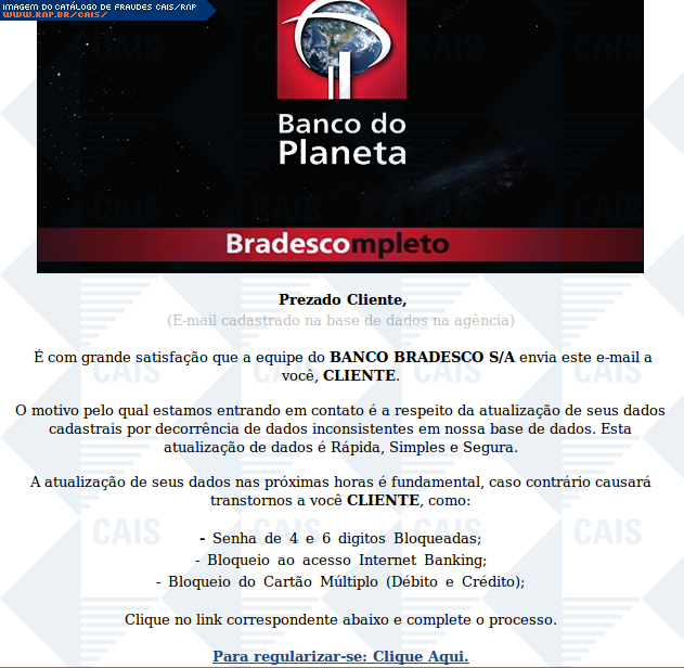 | comentário | A mensagem, em nome do banco Bradesco, pede que a vítima realize a atualização de dados cadastrais por decorrência de dados inconsistentes na base de dados do banco. O link para a suposta regularização leva a conteúdo malicioso que não estava mais disponível... (leia mais) | |
