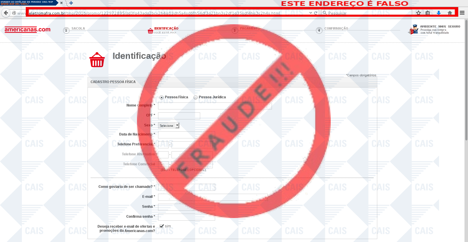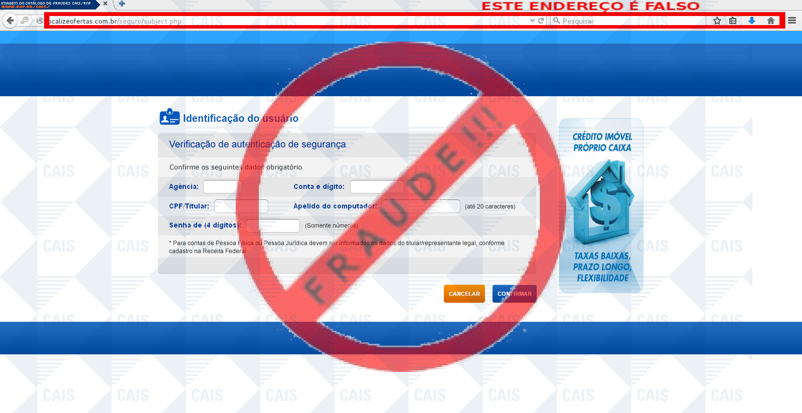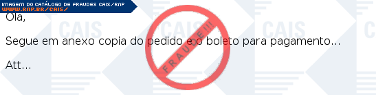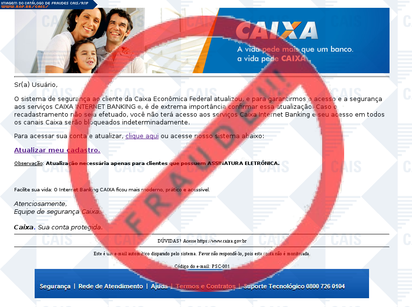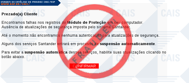 Esta página tem função informativa e educativa. Exibe uma coleção de imagens de phishing scam (fraudes eletrônicas) ou malware (código malicioso) veiculados por meio de spam (e-mail não-solicitado). Trata-se de conteúdo exemplificativo, não exaustivo, uma vez que não é possível contemplar todos os casos de fraudes existentes. Assim, caso você tenha conhecimento de um exemplar que não esteja aqui presente, isto não significa que não seja válido ou real. Inclusive incentivamos que você o envie para análise do CAIS para que, se for o caso, passe a integrar o nosso acervo.