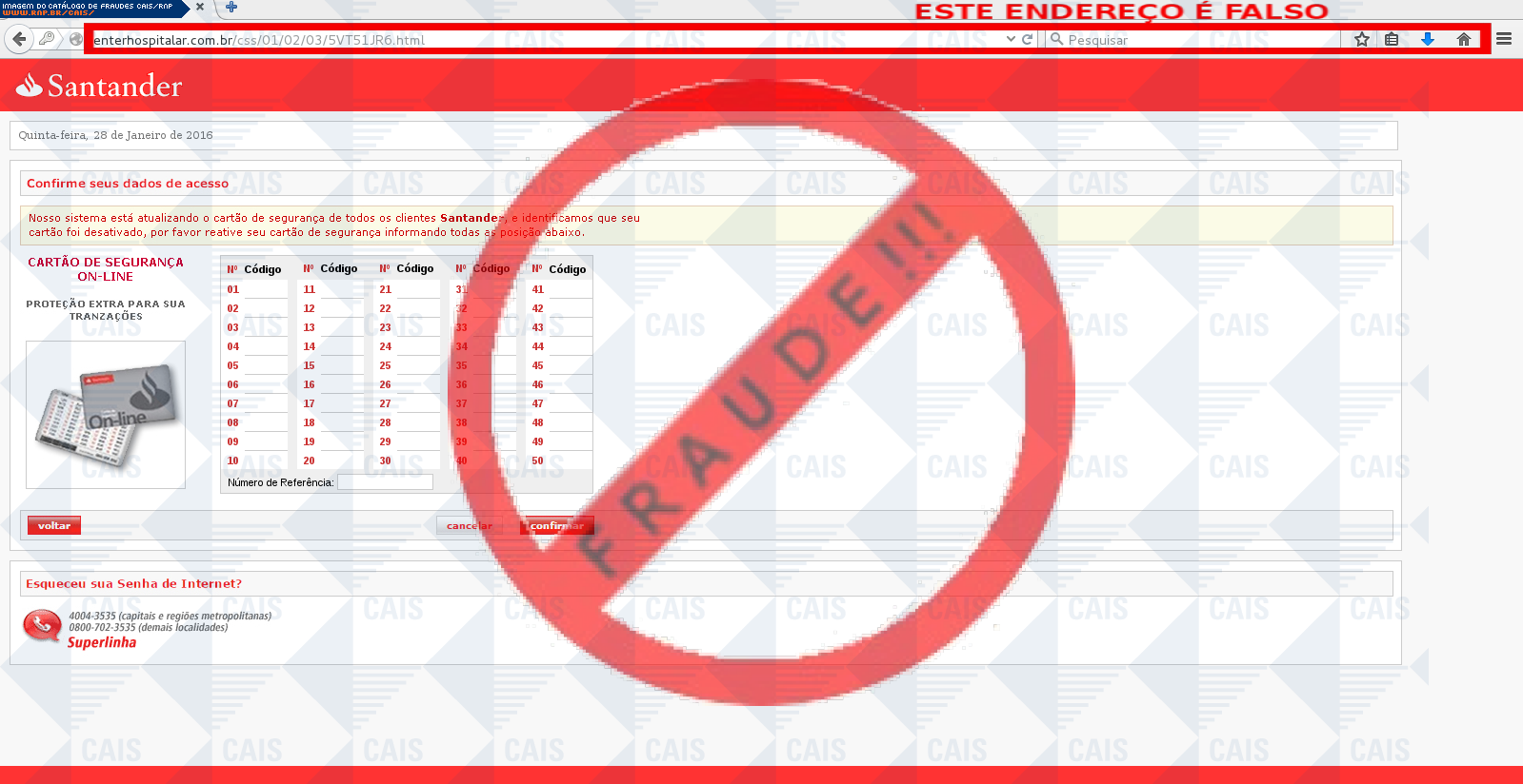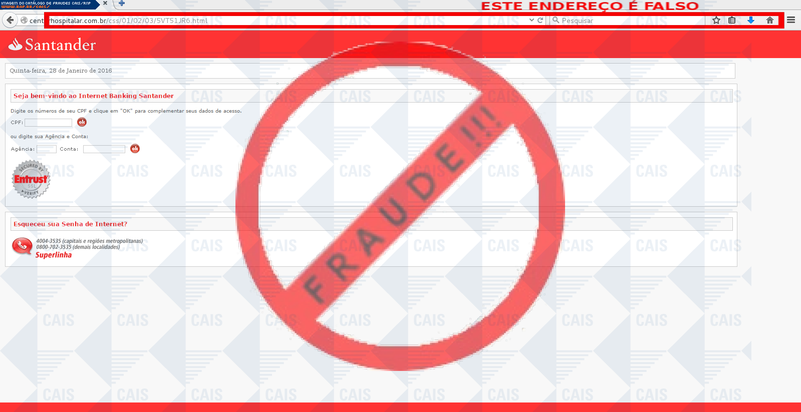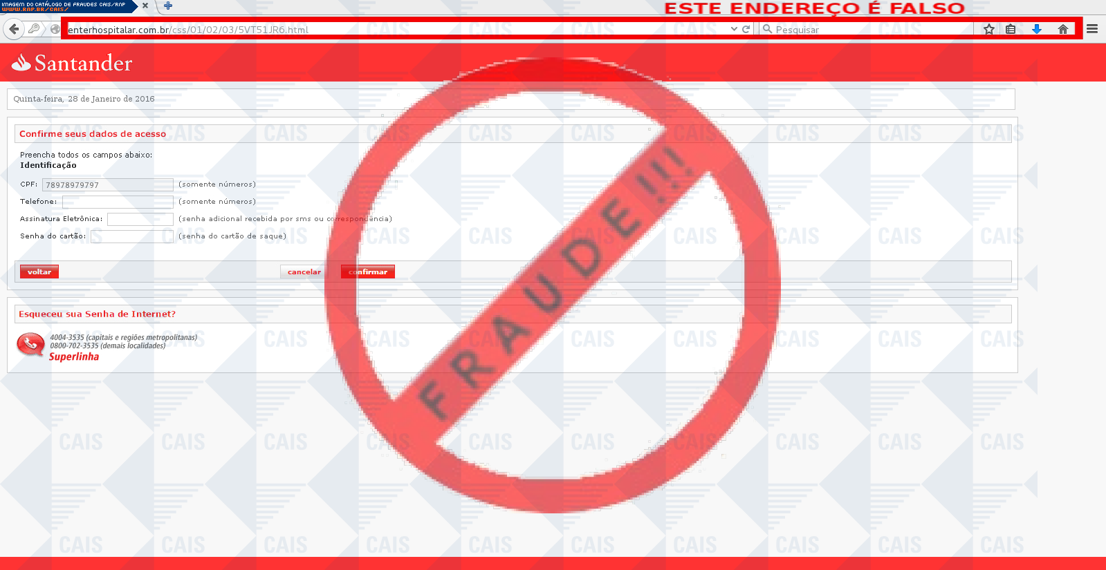Esta página tem função informativa e educativa. Exibe uma coleção de imagens de phishing scam (fraudes eletrônicas) ou malware (código malicioso) veiculados por meio de spam (e-mail não-solicitado). Trata-se de conteúdo exemplificativo, não exaustivo, uma vez que não é possível contemplar todos os casos de fraudes existentes. Assim, caso você tenha conhecimento de um exemplar que não esteja aqui presente, isto não significa que não seja válido ou real. Inclusive incentivamos que você o envie para análise do CAIS para que, se for o caso, passe a integrar o nosso acervo.