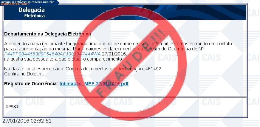 | comentário | A vítima recebe uma mensagem dizendo que há uma queixa de crime em seu cpf e passa um link para um Boletim de Ocorrência e uma Intimação. Porém, o link leva ao download de um malware de nome Win32.PWSZbot.jc. | |