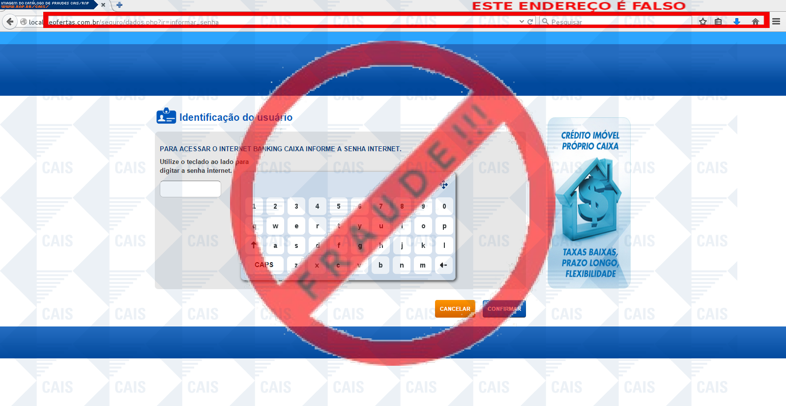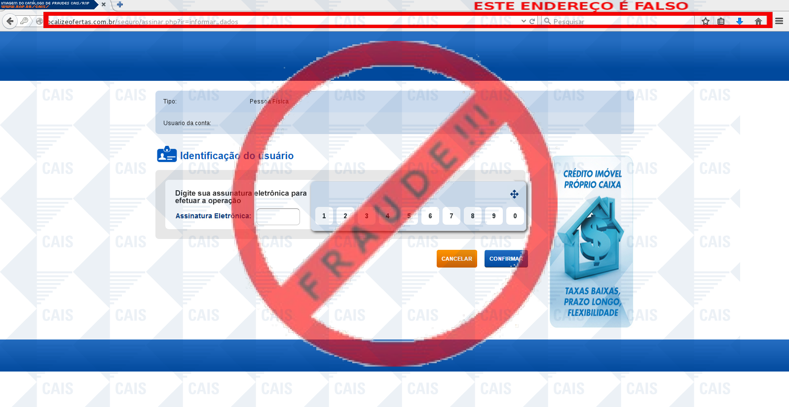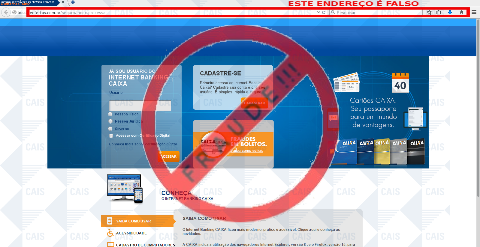 | comentário | A vítima recebe uma mensagem dizendo que ela deve atualizar seu cadastro no internet banking da Caixa Econômica Federal, sob pena de perder o acesso ao mesmo. Entretanto, o link na mensagem leva a uma página falsa que tenta roubar informações bancárias da... (leia mais) | |