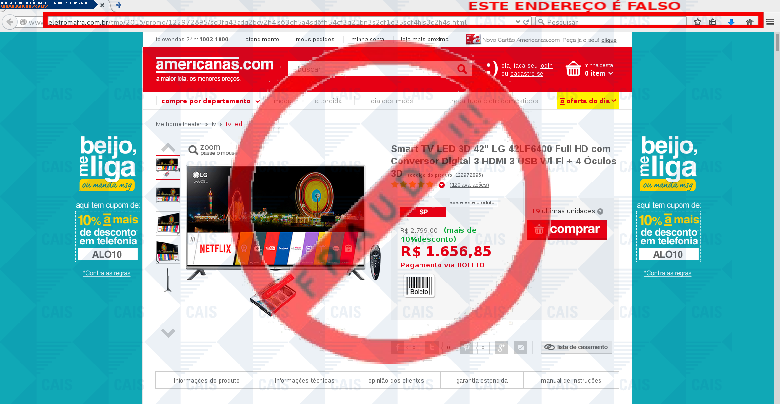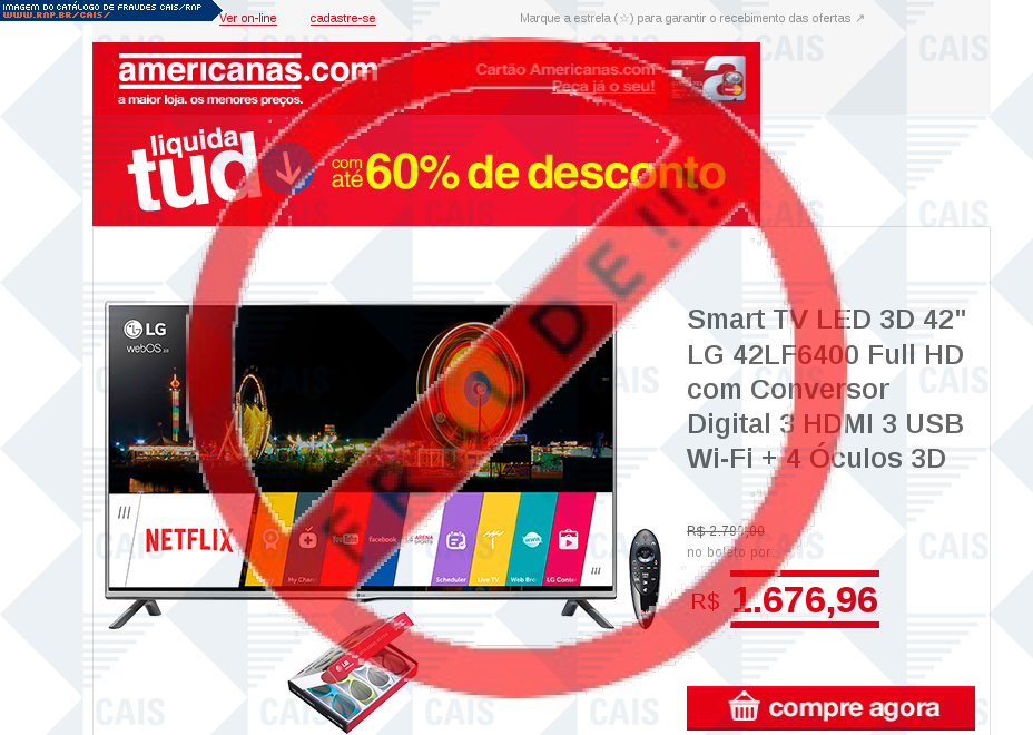 | comentário | A vítima recebe uma mensagem com uma promoção de Smart TV, supostamente das Lojas Americanas, com um preço muito abaixo do mercado. Entretanto, o link na mensagem leva a uma página falsa que tenta roubar informações da vítima. | |