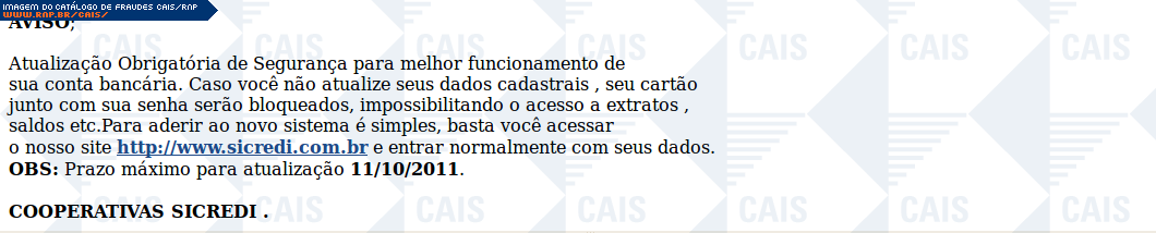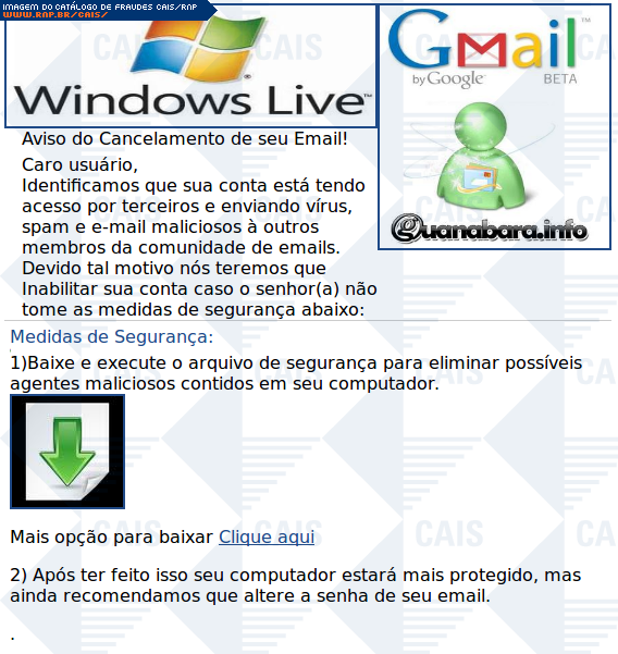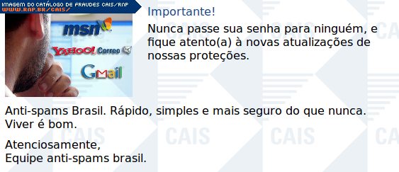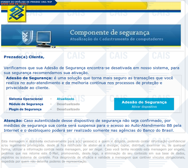 Esta página tem função informativa e educativa. Exibe uma coleção de imagens de phishing scam (fraudes eletrônicas) ou malware (código malicioso) veiculados por meio de spam (e-mail não-solicitado). Trata-se de conteúdo exemplificativo, não exaustivo, uma vez que não é possível contemplar todos os casos de fraudes existentes. Assim, caso você tenha conhecimento de um exemplar que não esteja aqui presente, isto não significa que não seja válido ou real. Inclusive incentivamos que você o envie para análise do CAIS para que, se for o caso, passe a integrar o nosso acervo.