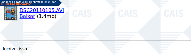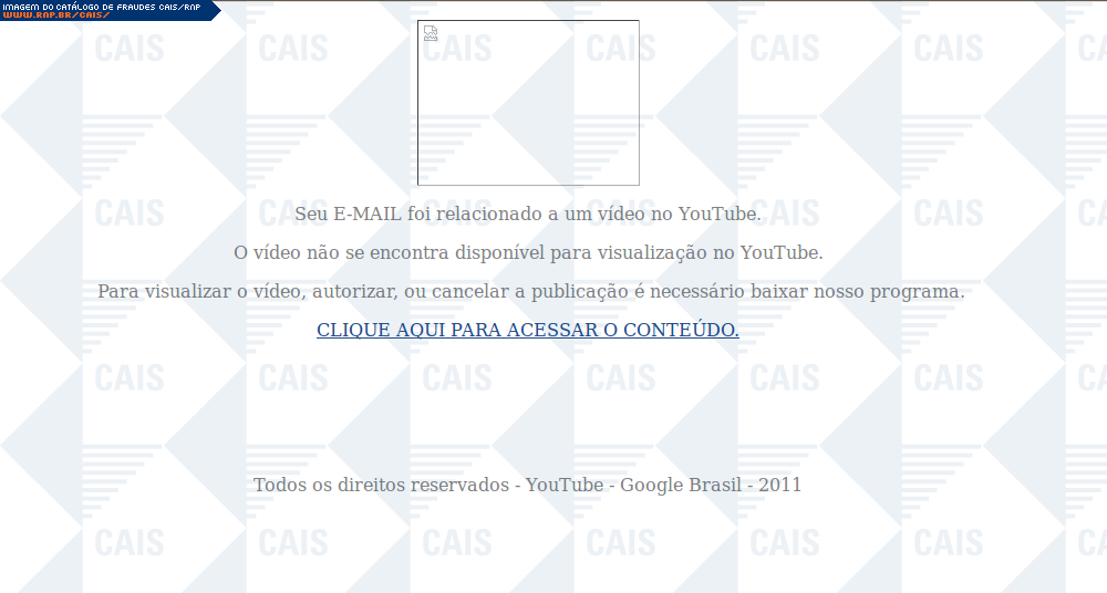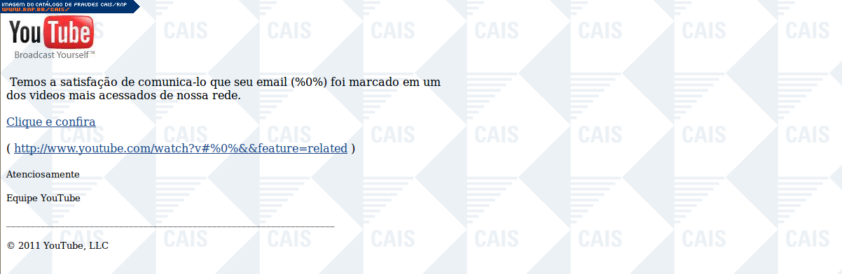 | comentário | A fraude informa a vítima que ela foi relacionada em um vídeo do site Youtube, e que para vizualisar o vídeo ela deve fazer o download de um arquivo. Provavlmente tratava-se de um arquivo malicioso, porém este não estava disponível no momento da análise. | |