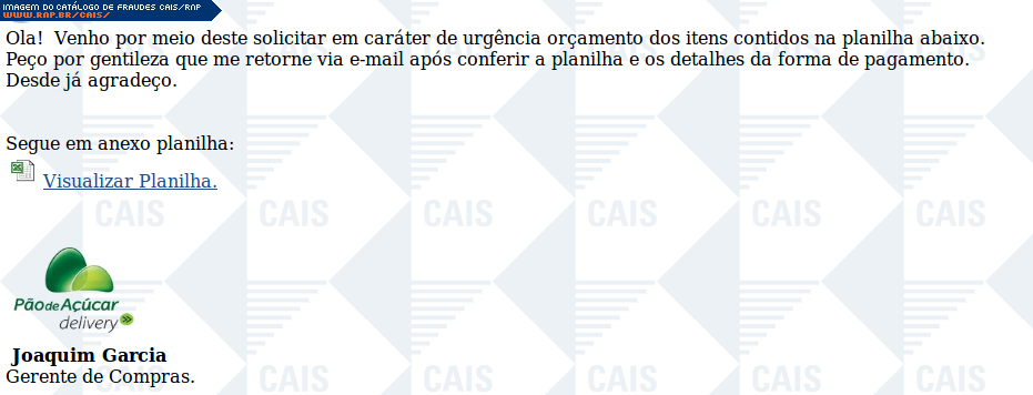 | comentário | A fraude contém uma mensagem supostamente enviada por um representante do grupo Pão de Açúcar pedindo que seja feito o orçamento dos items listados em uma planilha enviada em anexo. O arquivo anexado provavelmente tratava-se de um malware, contudo este não... (leia mais) | |