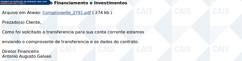 | comentário | A fraude contém um link para o download de um suposto comprovante de transferência para a conta da vítima. O conteúdo do arquivo malicioso não estava mais disponível no momento da análise. | |