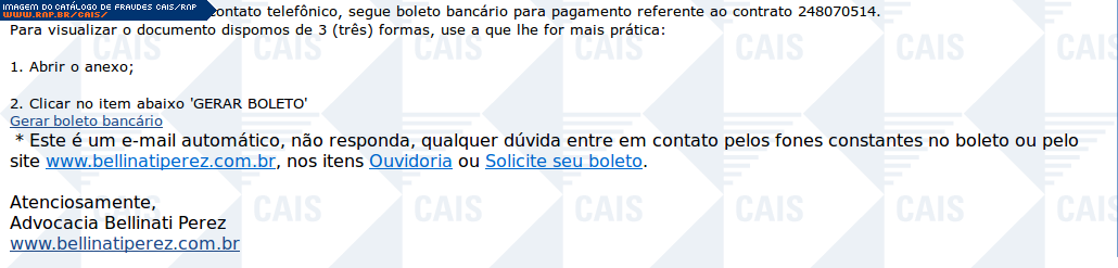 | comentário | A fraude contém um link para o download de um suposto boleto bancário referente a um contrato. O arquivo provavelmente tratava-se de um malware. Contudo este não estava disponível no momento da análise. | |