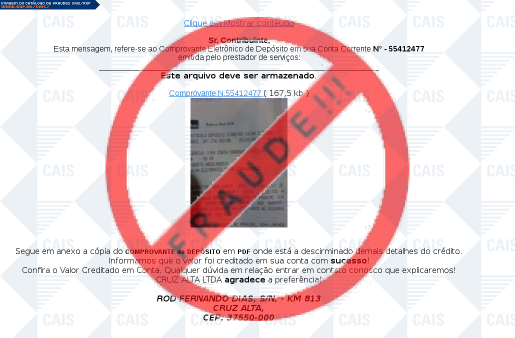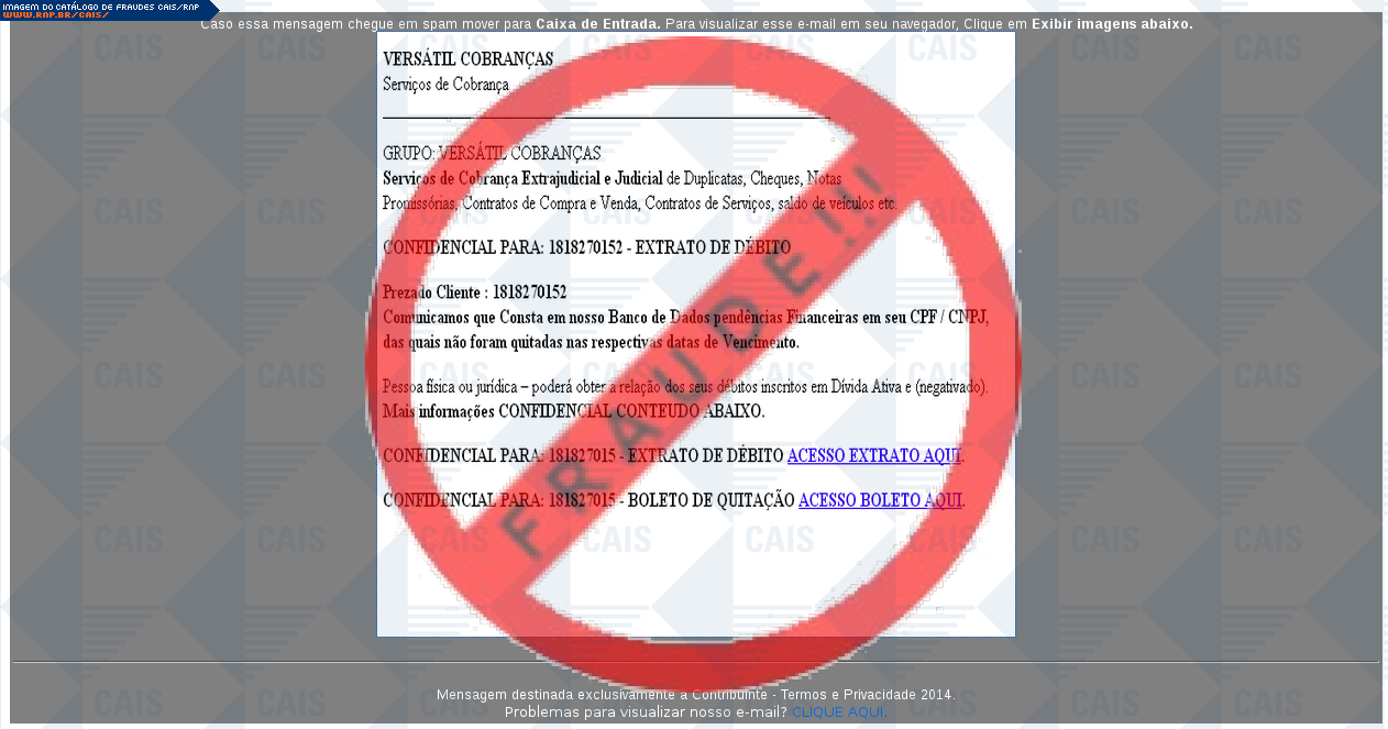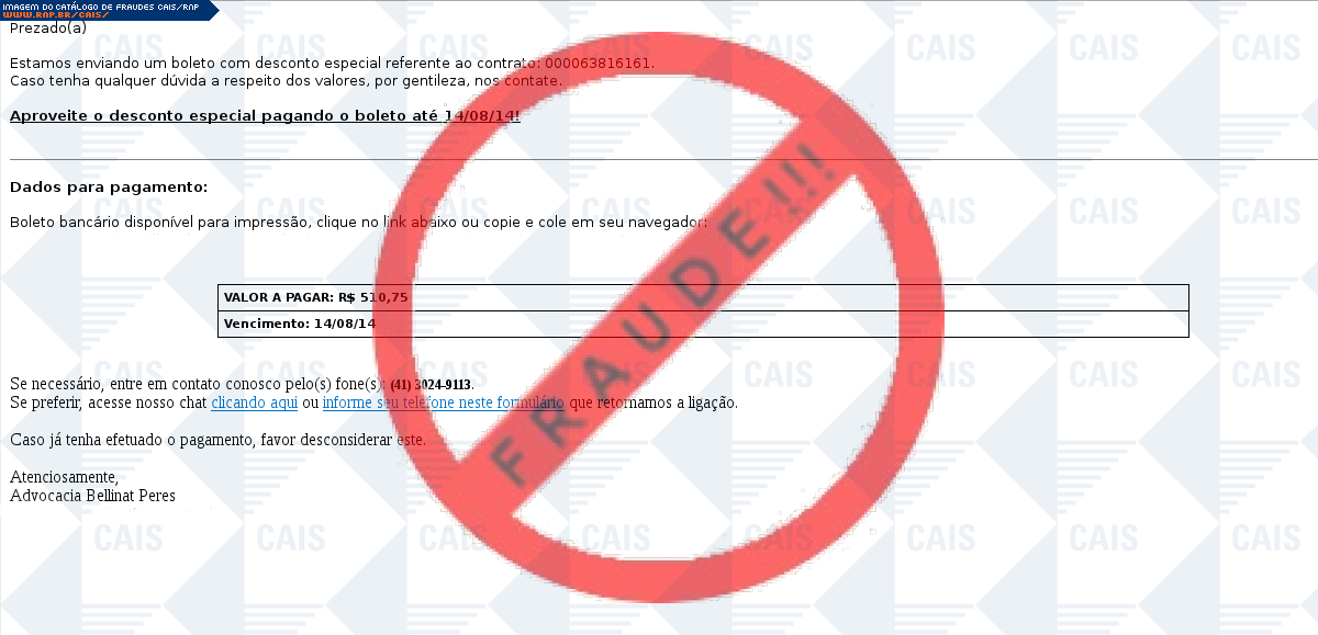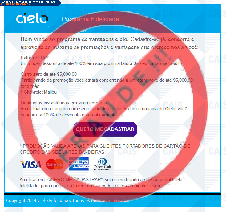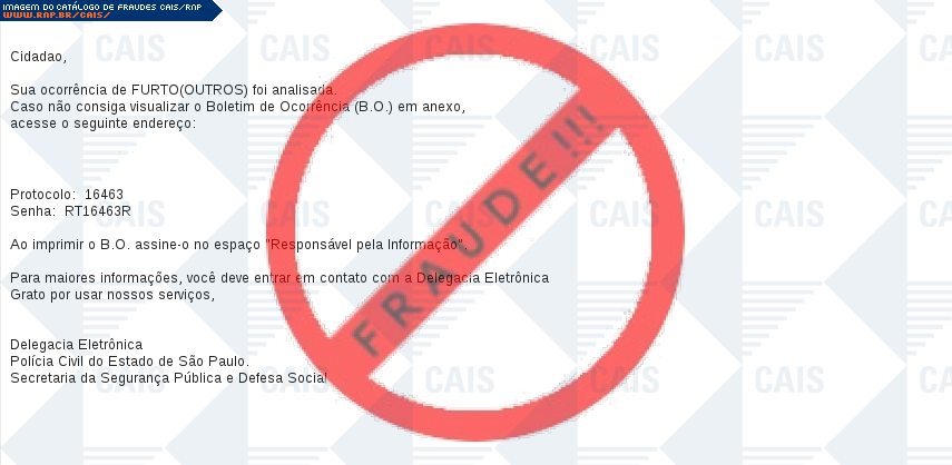Esta página tem função informativa e educativa. Exibe uma coleção de imagens de phishing scam (fraudes eletrônicas) ou malware (código malicioso) veiculados por meio de spam (e-mail não-solicitado). Trata-se de conteúdo exemplificativo, não exaustivo, uma vez que não é possível contemplar todos os casos de fraudes existentes. Assim, caso você tenha conhecimento de um exemplar que não esteja aqui presente, isto não significa que não seja válido ou real. Inclusive incentivamos que você o envie para análise do CAIS para que, se for o caso, passe a integrar o nosso acervo.