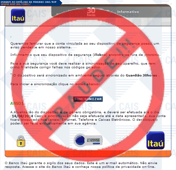 | comentário | A vítima recebe uma mensagem informando que seu seu dispositivo de segurança itoken não está sincronizado sendo necessário realizar a sincronização no link disponível, entretanto a página é falsa criada para roubar os dados bancários do usuário. | |