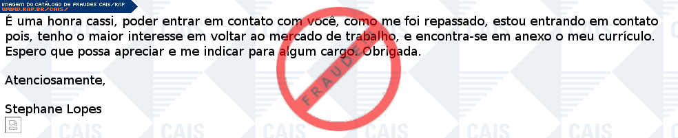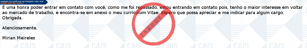 | comentário | O usuário recebe uma mensagem contendo um currículo para análise disponível para download, no entanto o arquivo originado é malicioso criado para roubar informações da vítima e instalar outros arquivos fraudulentos com o nome de Trojan.Win32.Generic!BT. | |