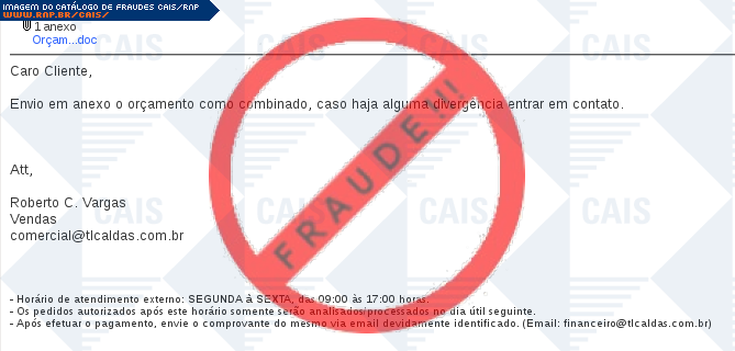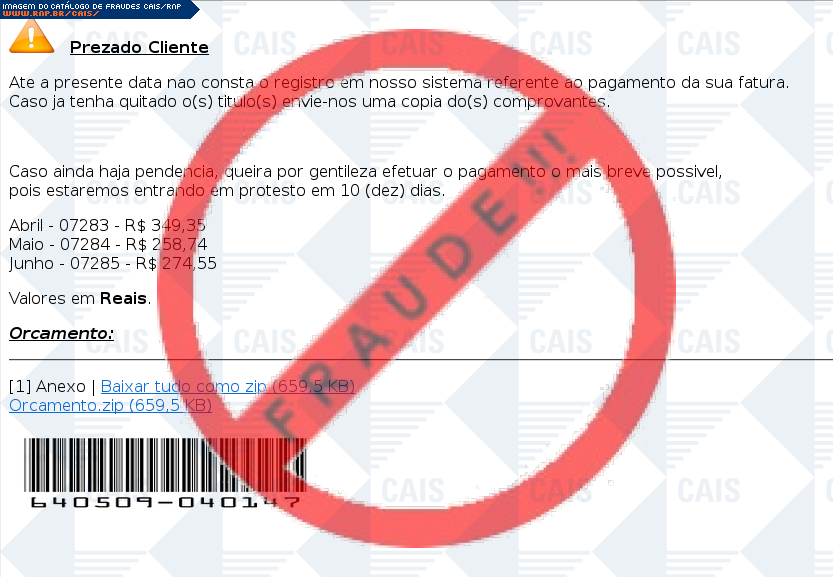 Esta página tem função informativa e educativa. Exibe uma coleção de imagens de phishing scam (fraudes eletrônicas) ou malware (código malicioso) veiculados por meio de spam (e-mail não-solicitado). Trata-se de conteúdo exemplificativo, não exaustivo, uma vez que não é possível contemplar todos os casos de fraudes existentes. Assim, caso você tenha conhecimento de um exemplar que não esteja aqui presente, isto não significa que não seja válido ou real. Inclusive incentivamos que você o envie para análise do CAIS para que, se for o caso, passe a integrar o nosso acervo.
