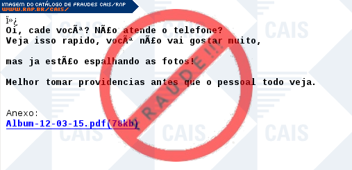| comentário | O usuário recebe uma mensagem contendo fotos pessoais que estão sendo divulgadas sem seu conhecimento disponível para download, no entanto o arquivo originado é malicioso criado para roubar informações da vítima e instalar outros arquivos fraudulentos com... (leia mais) | |