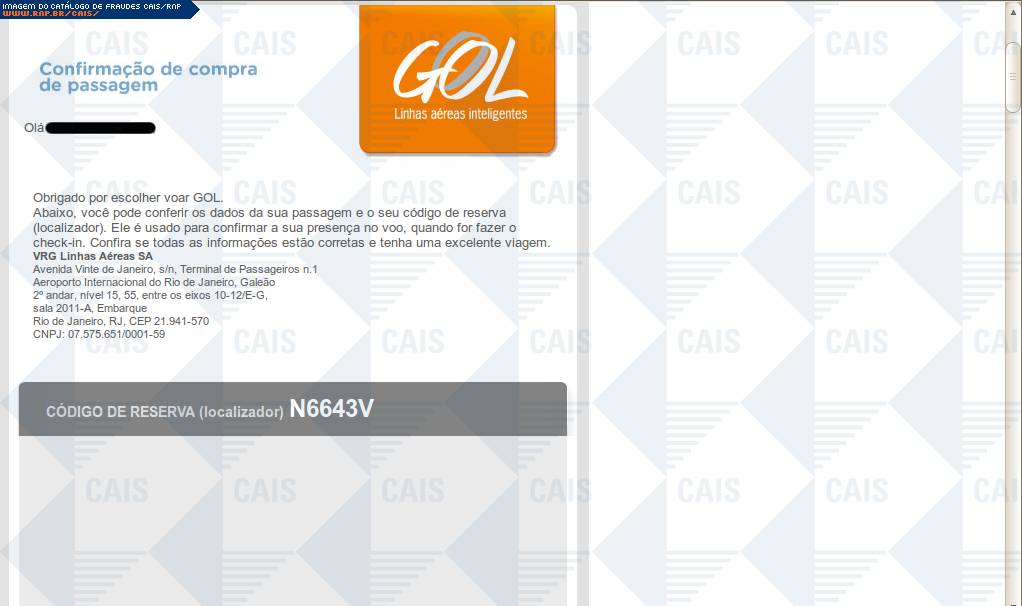 | comentário | A mensagem se passa pela confirmação de compra de passagens aérias que teriam sido feitas em nome da vítima. A mensagem contém informações sobre a vítima e os supostos voos. O conteúdo malicioso não estava disponível no momento da análise. | |