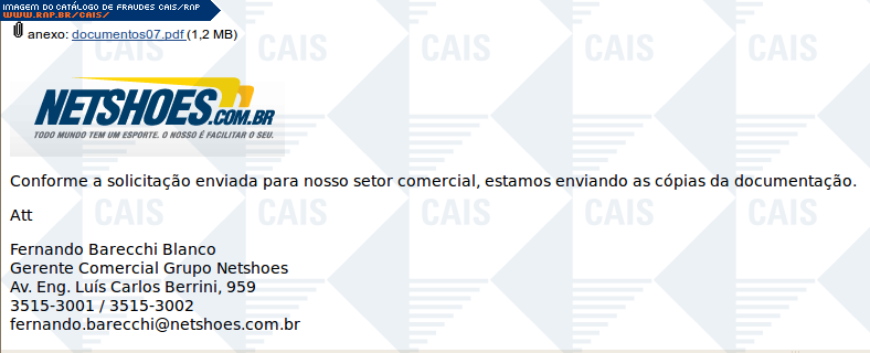 | comentário | A mensagem, supostamente enviada pela Netshoes, contém um link para documentos. O conteúdo malicioso não estava disponível no momento da análise. | |