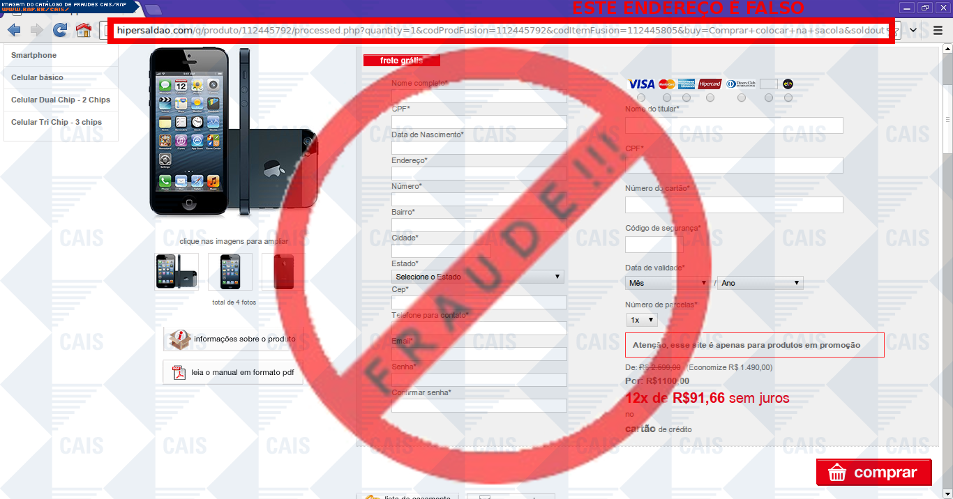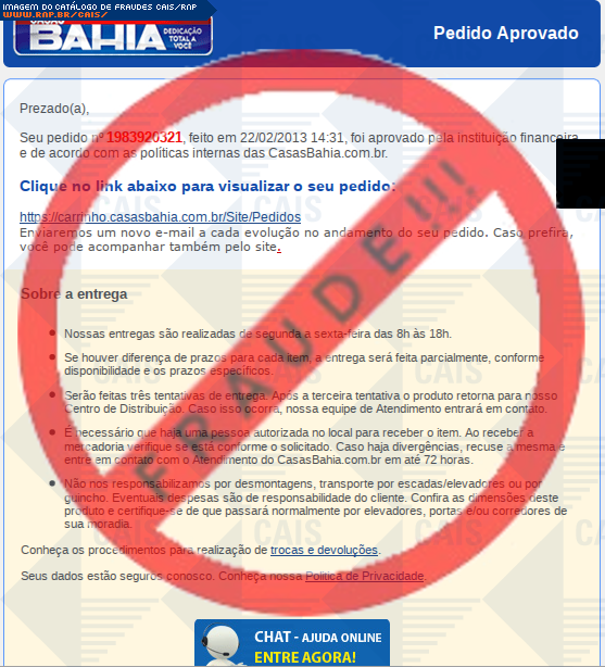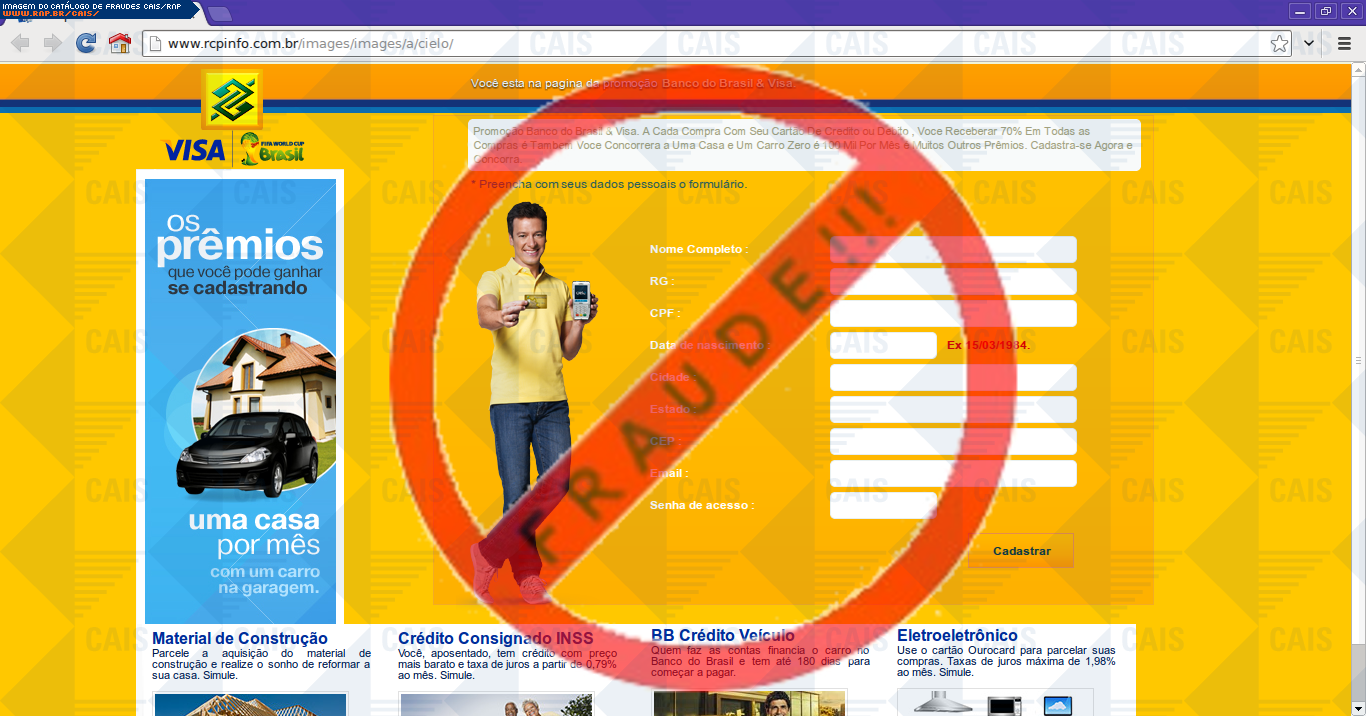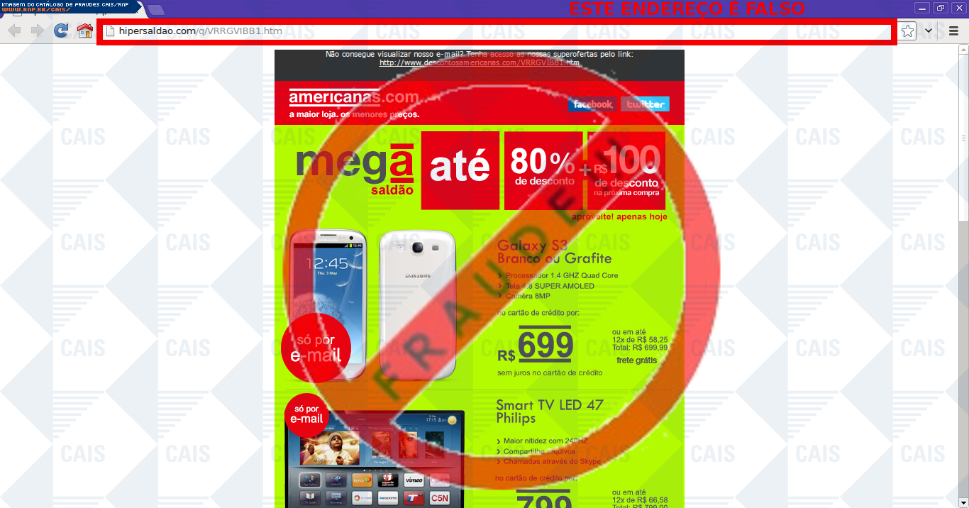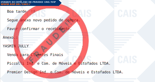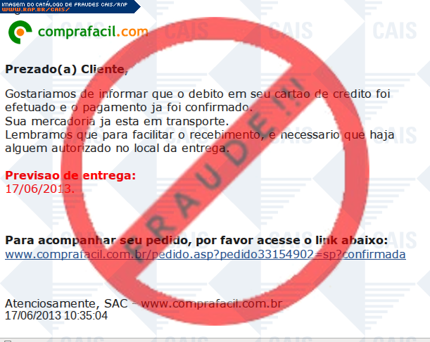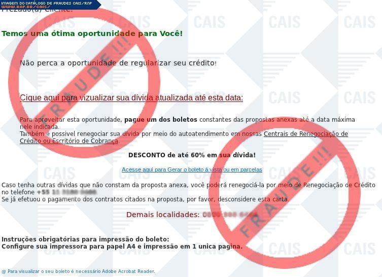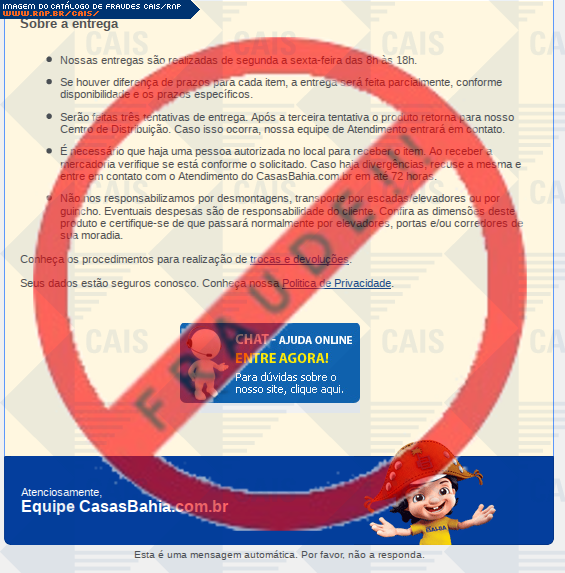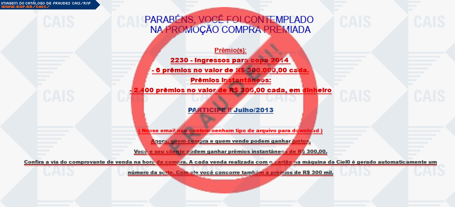 Esta página tem função informativa e educativa. Exibe uma coleção de imagens de phishing scam (fraudes eletrônicas) ou malware (código malicioso) veiculados por meio de spam (e-mail não-solicitado). Trata-se de conteúdo exemplificativo, não exaustivo, uma vez que não é possível contemplar todos os casos de fraudes existentes. Assim, caso você tenha conhecimento de um exemplar que não esteja aqui presente, isto não significa que não seja válido ou real. Inclusive incentivamos que você o envie para análise do CAIS para que, se for o caso, passe a integrar o nosso acervo.
